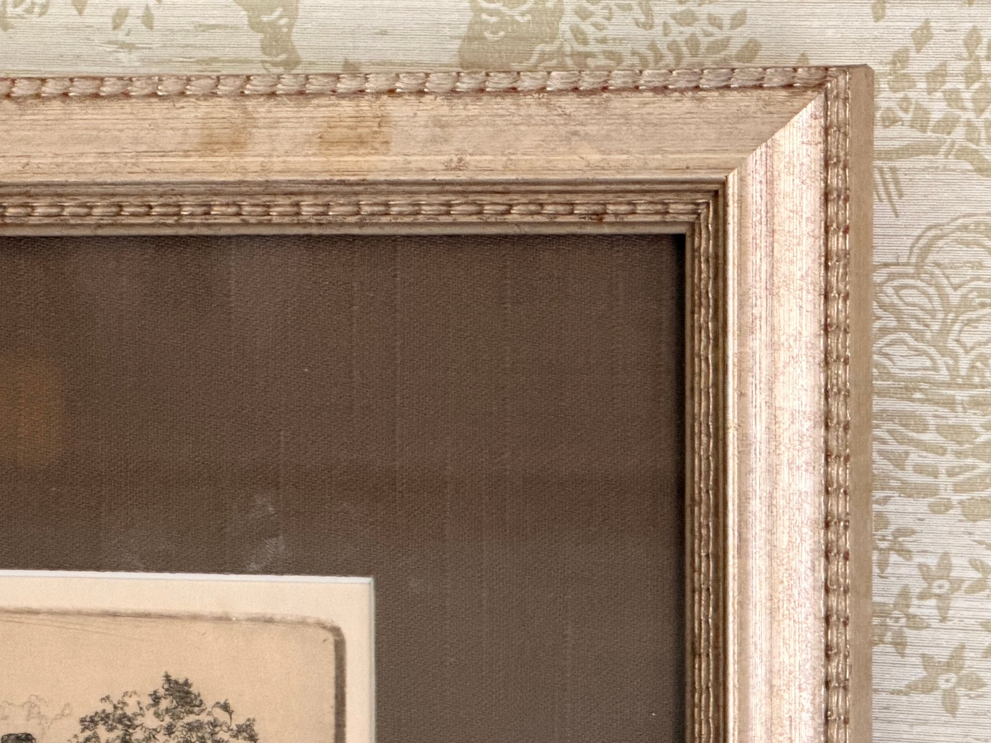 Visible toning and discoloration to the paper, consistent with age. Backing shows wear and staining. Overall stable and suitable for display.