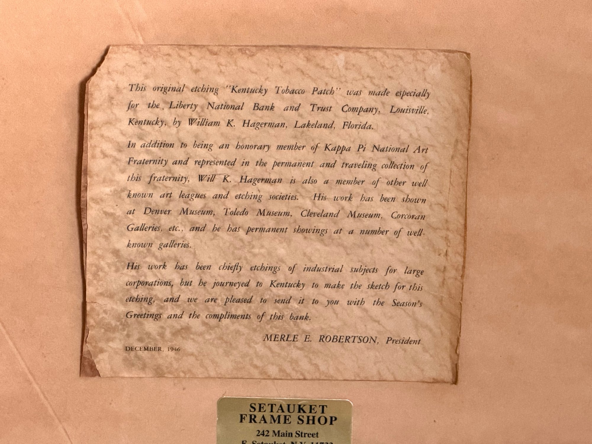 Accompanied by a verso label noting the work was produced for the Liberty National Bank and Trust Company, Louisville, Kentucky, dated December 1946.