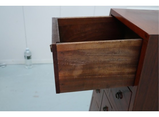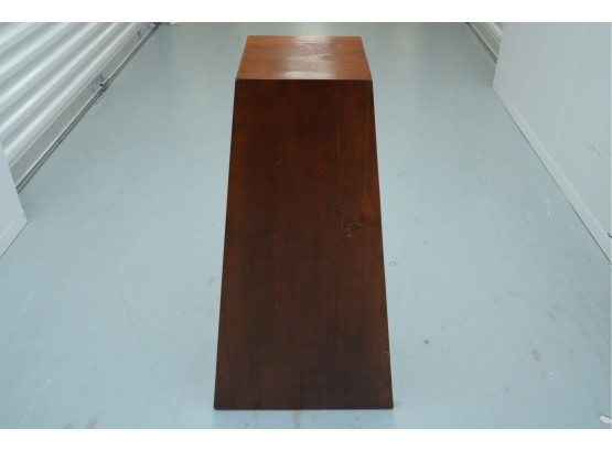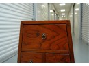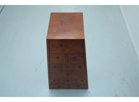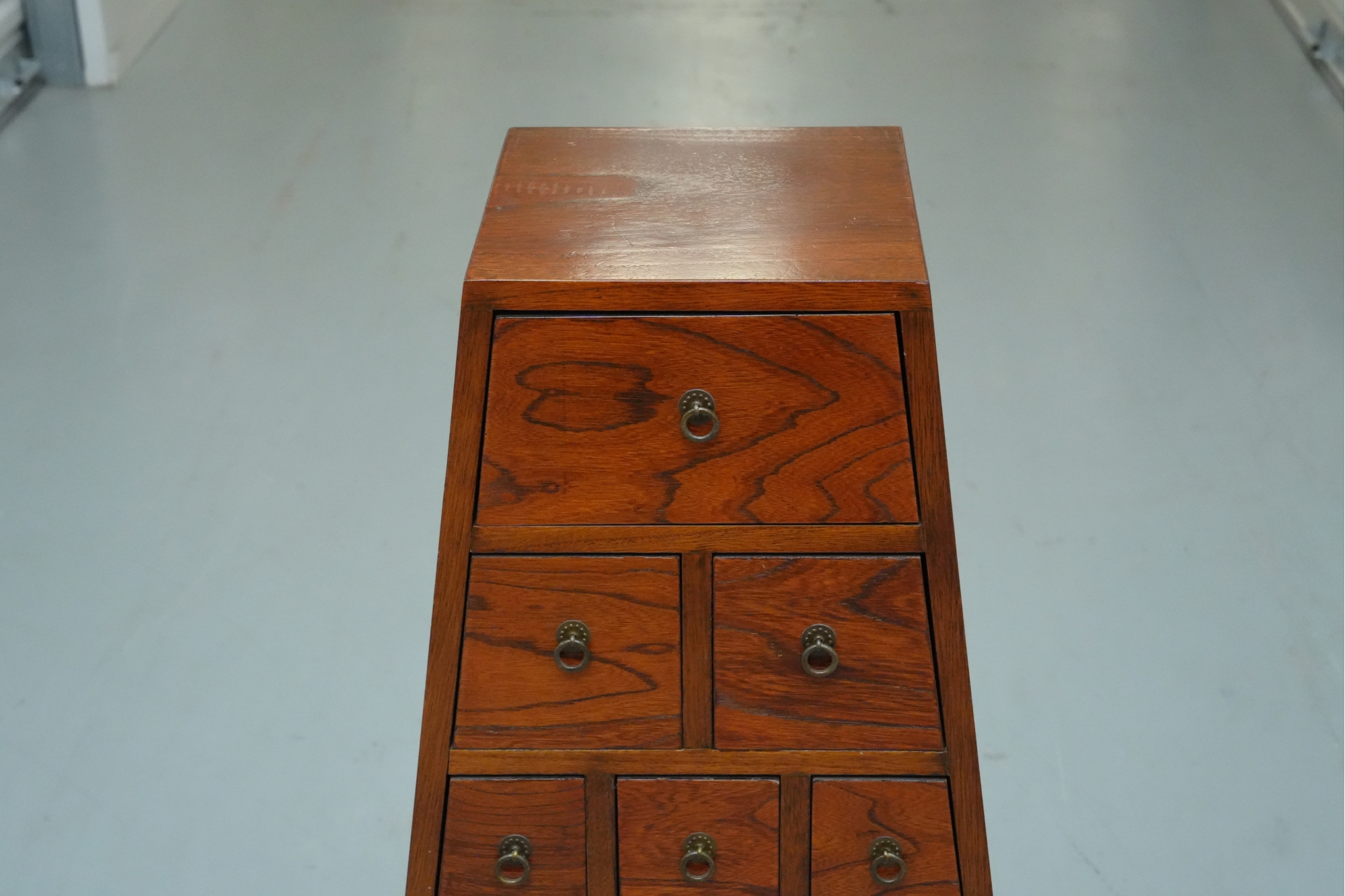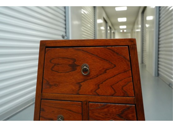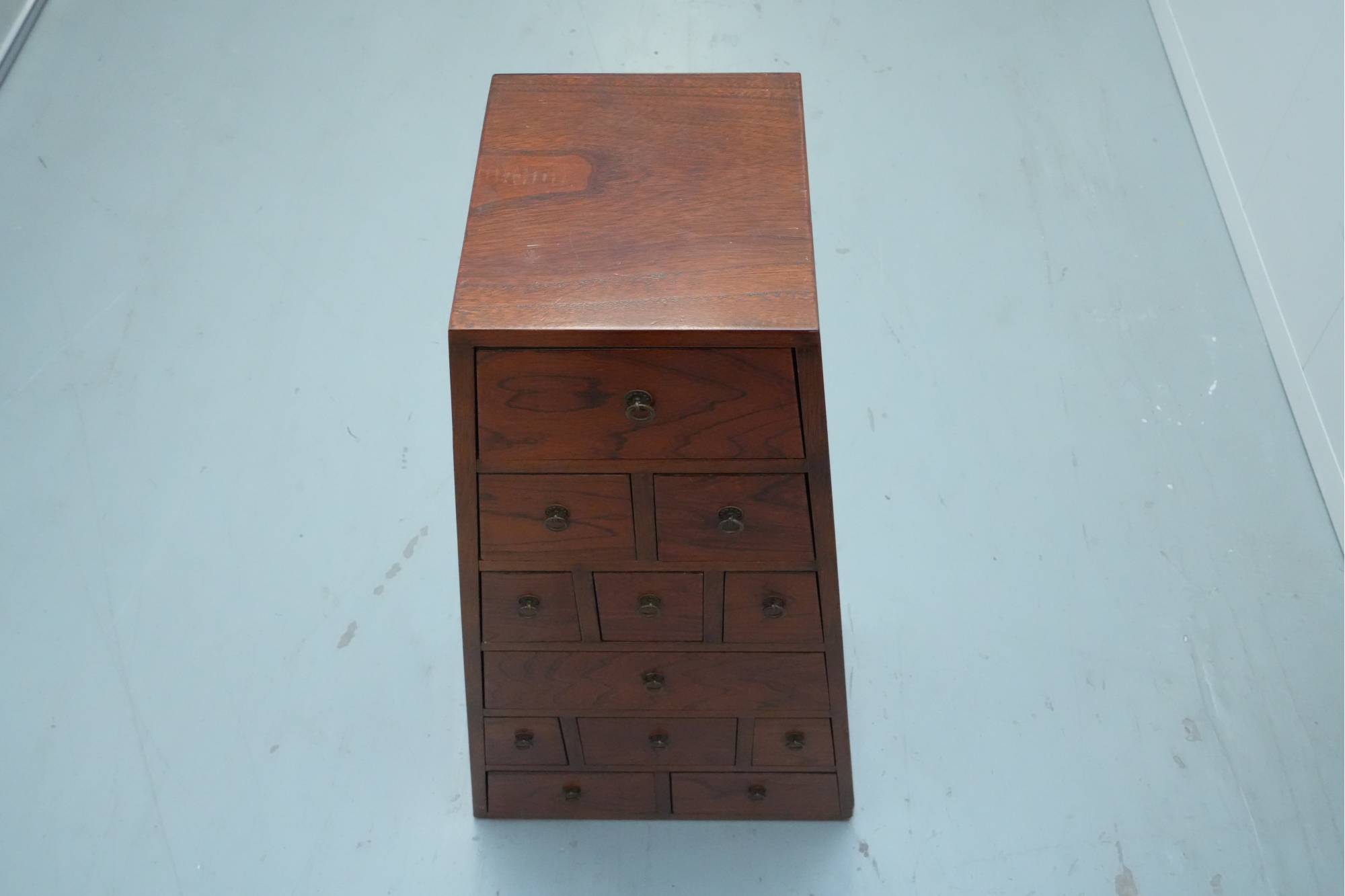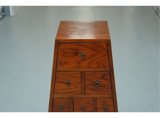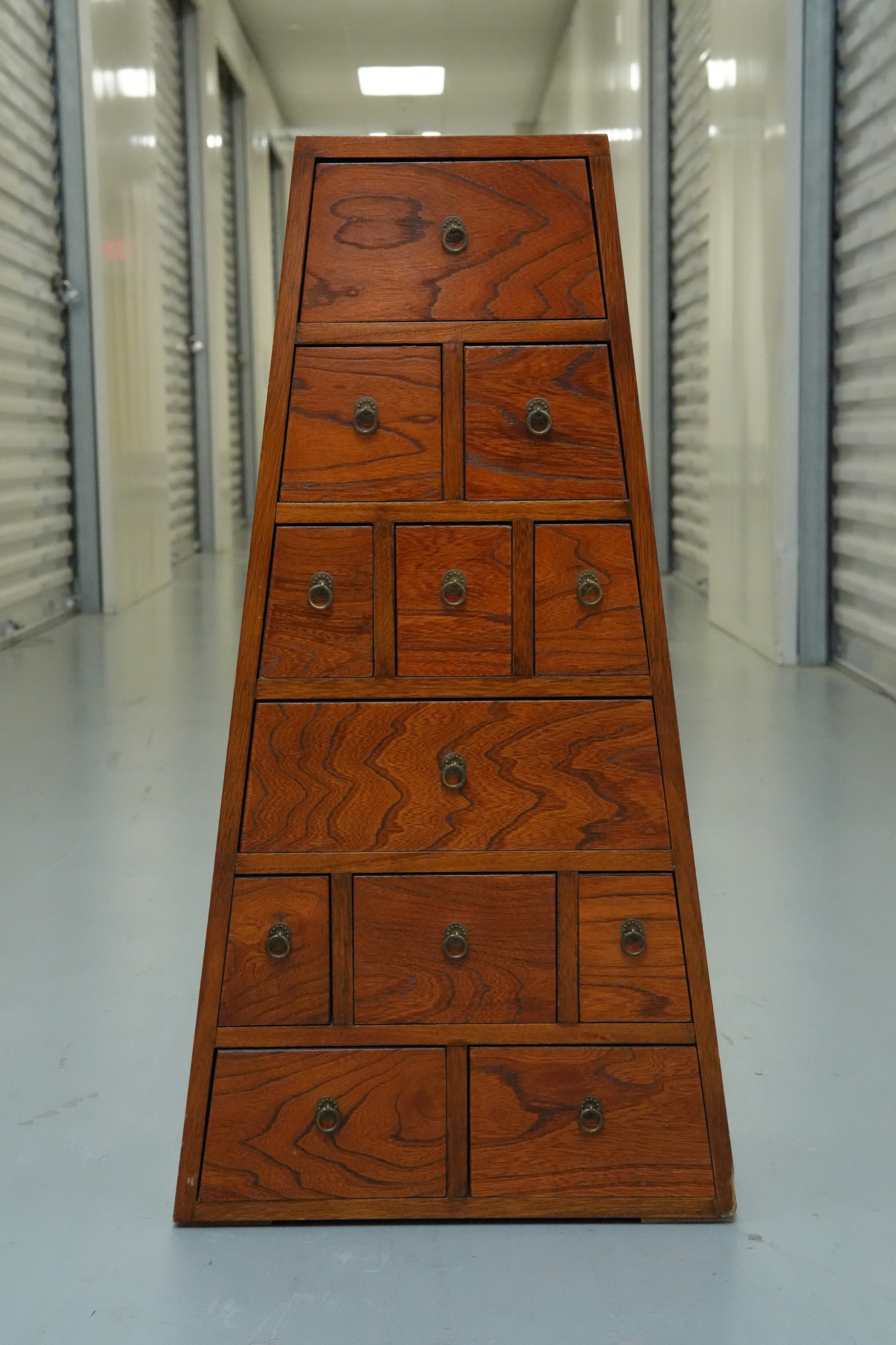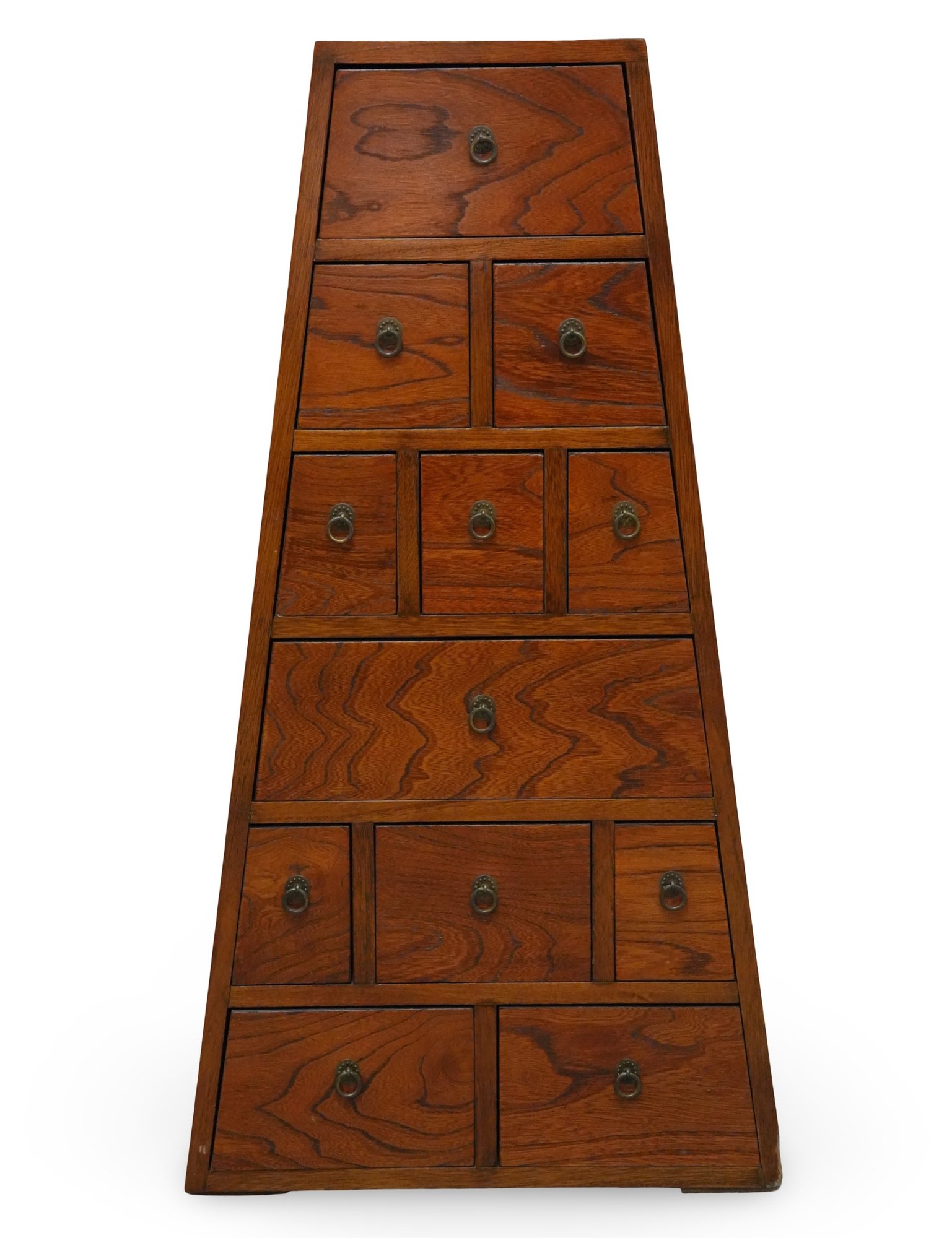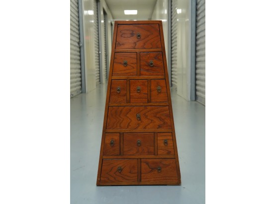 Vintage pyramid apothecary chest crafted in varnished wood, featuring a distinctive triangular form with nine graduated drawers, each fitted with a round metal ring pull and inspired by Japanese Tansu or Korean design traditions.