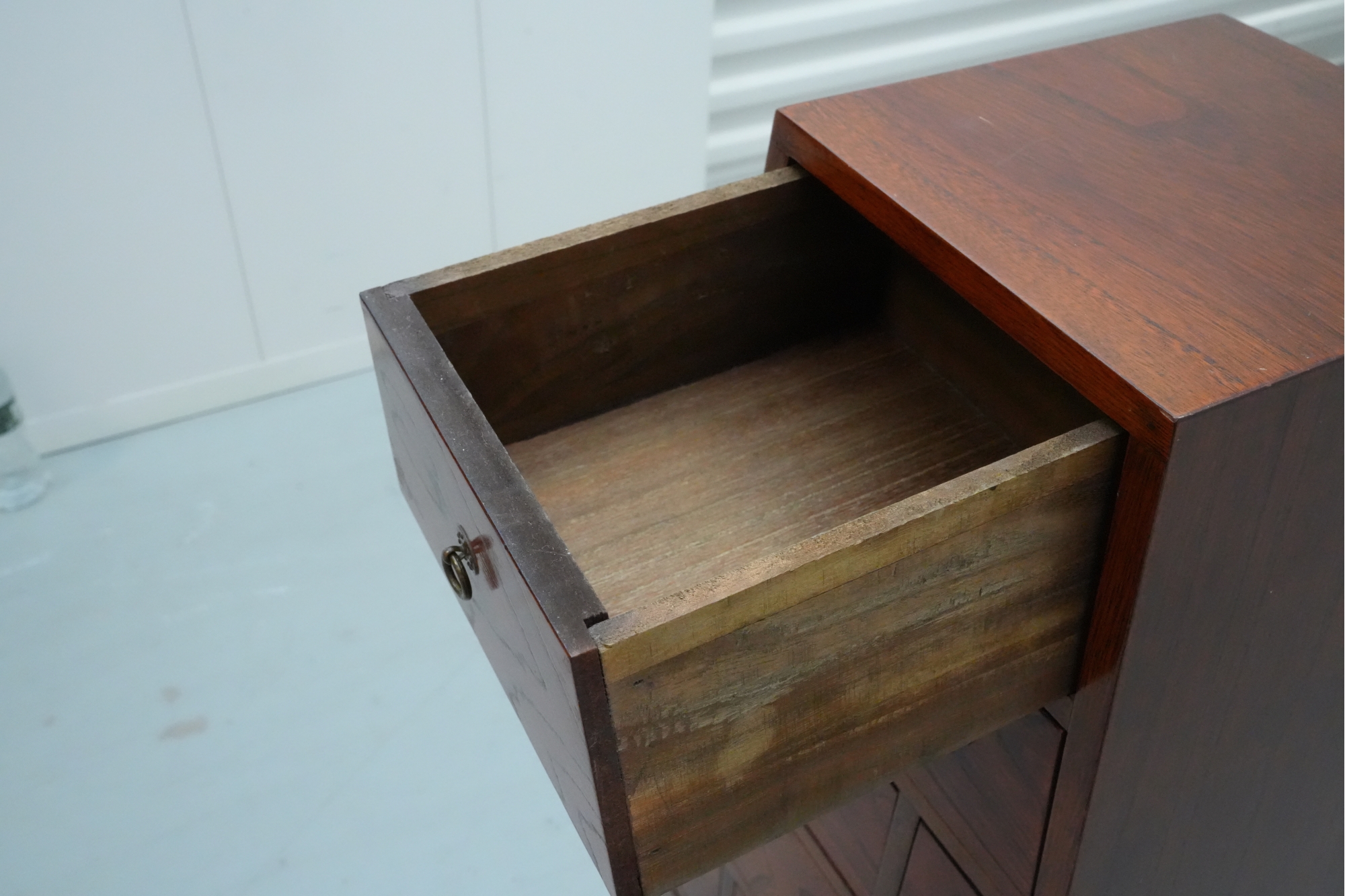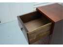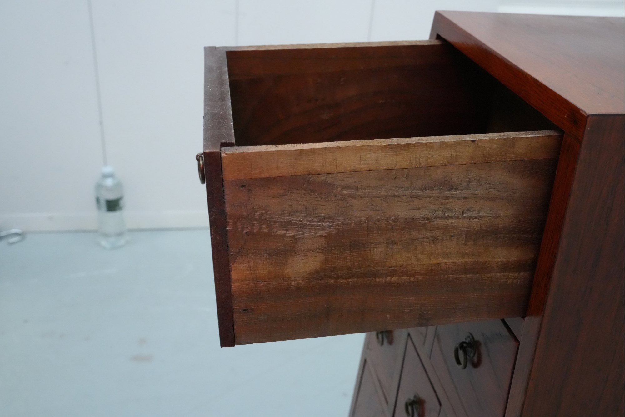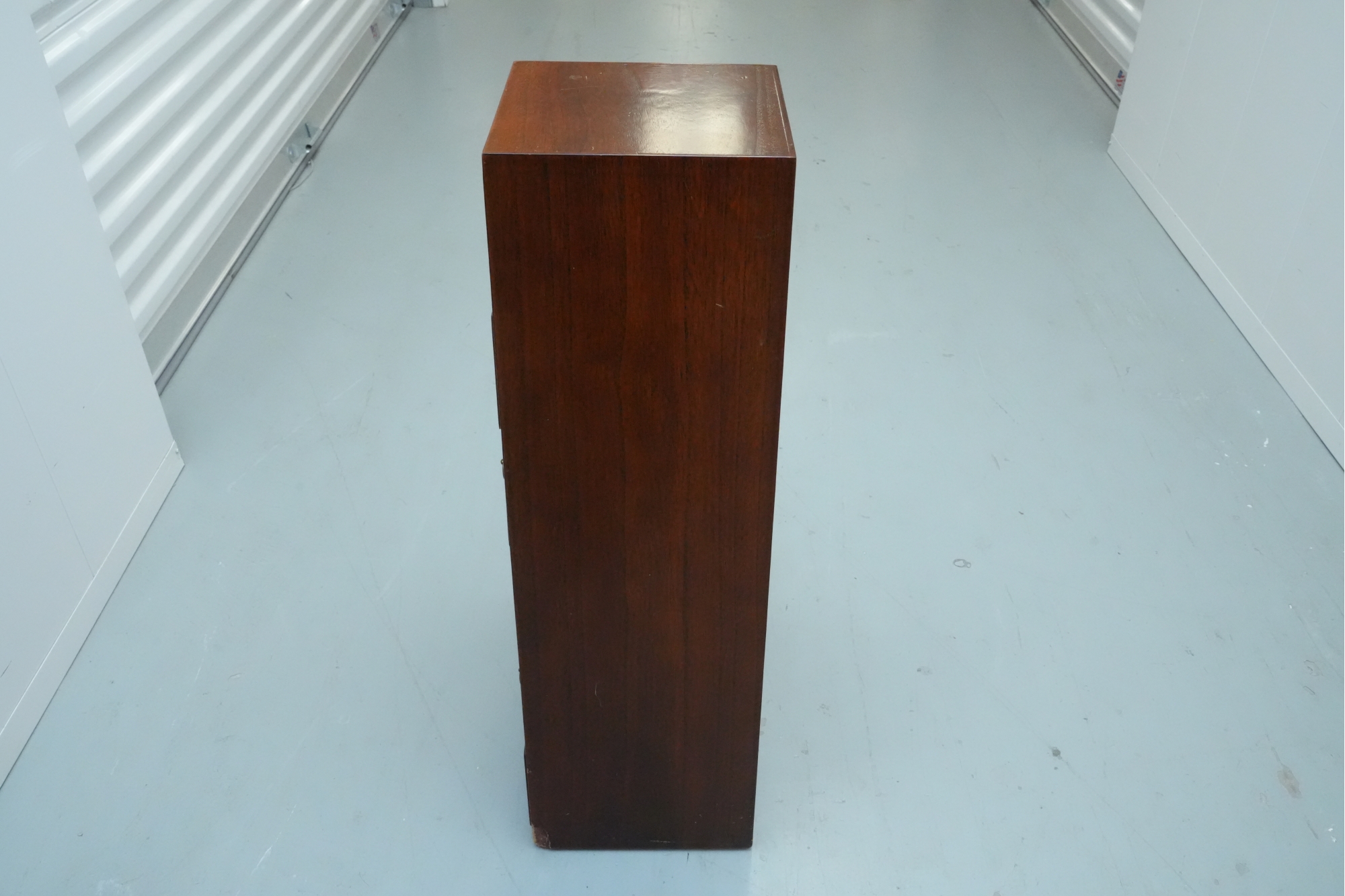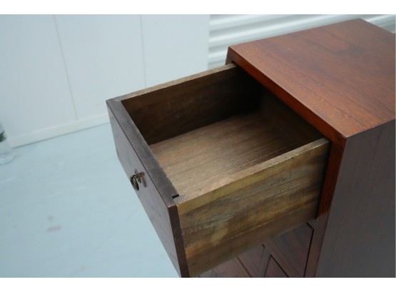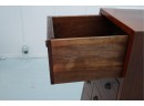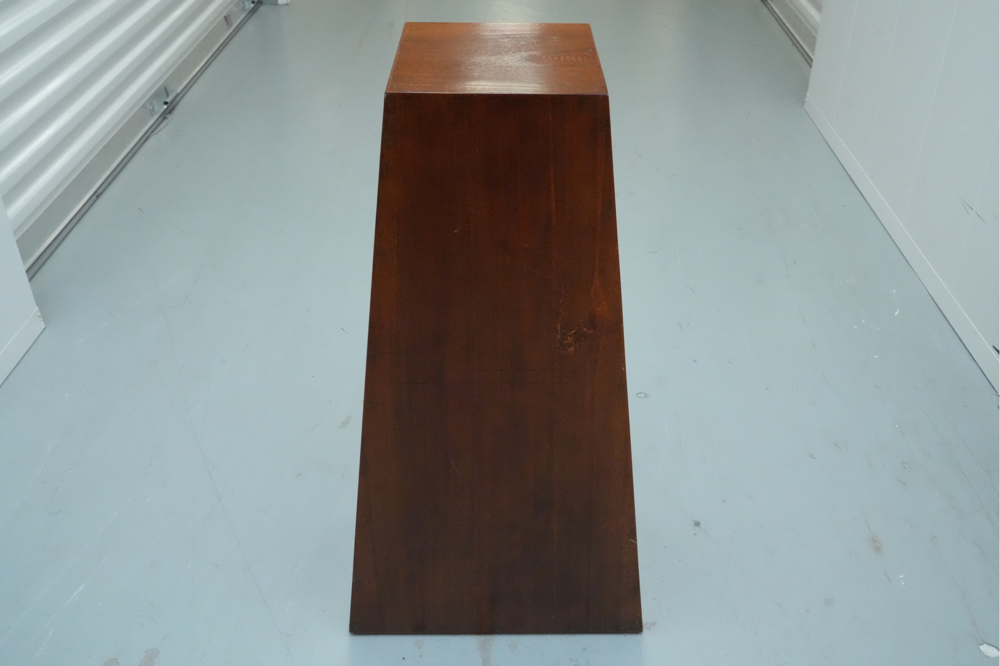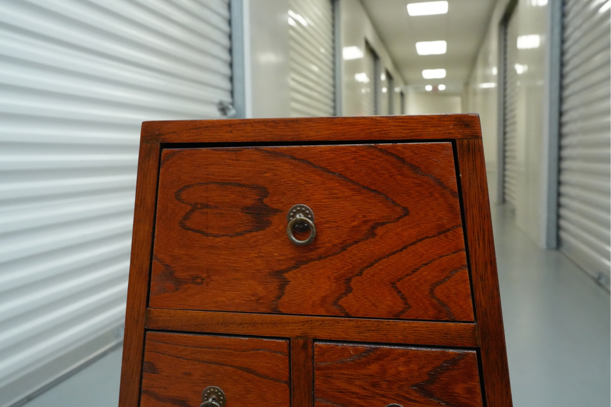 Vintage pyramid apothecary chest crafted in varnished wood, featuring a distinctive triangular form with nine graduated drawers, each fitted with a round metal ring pull and inspired by Japanese Tansu or Korean design traditions.