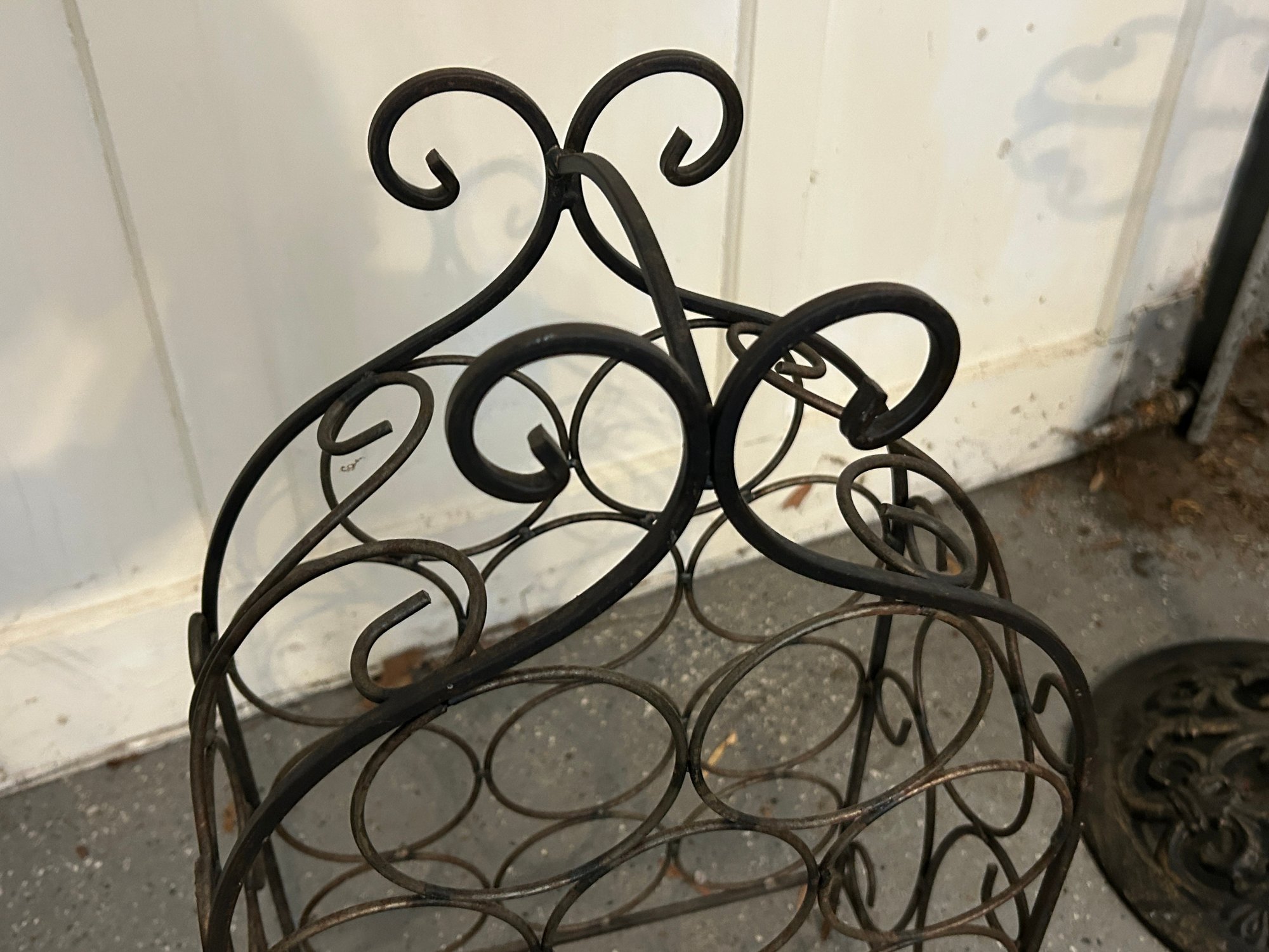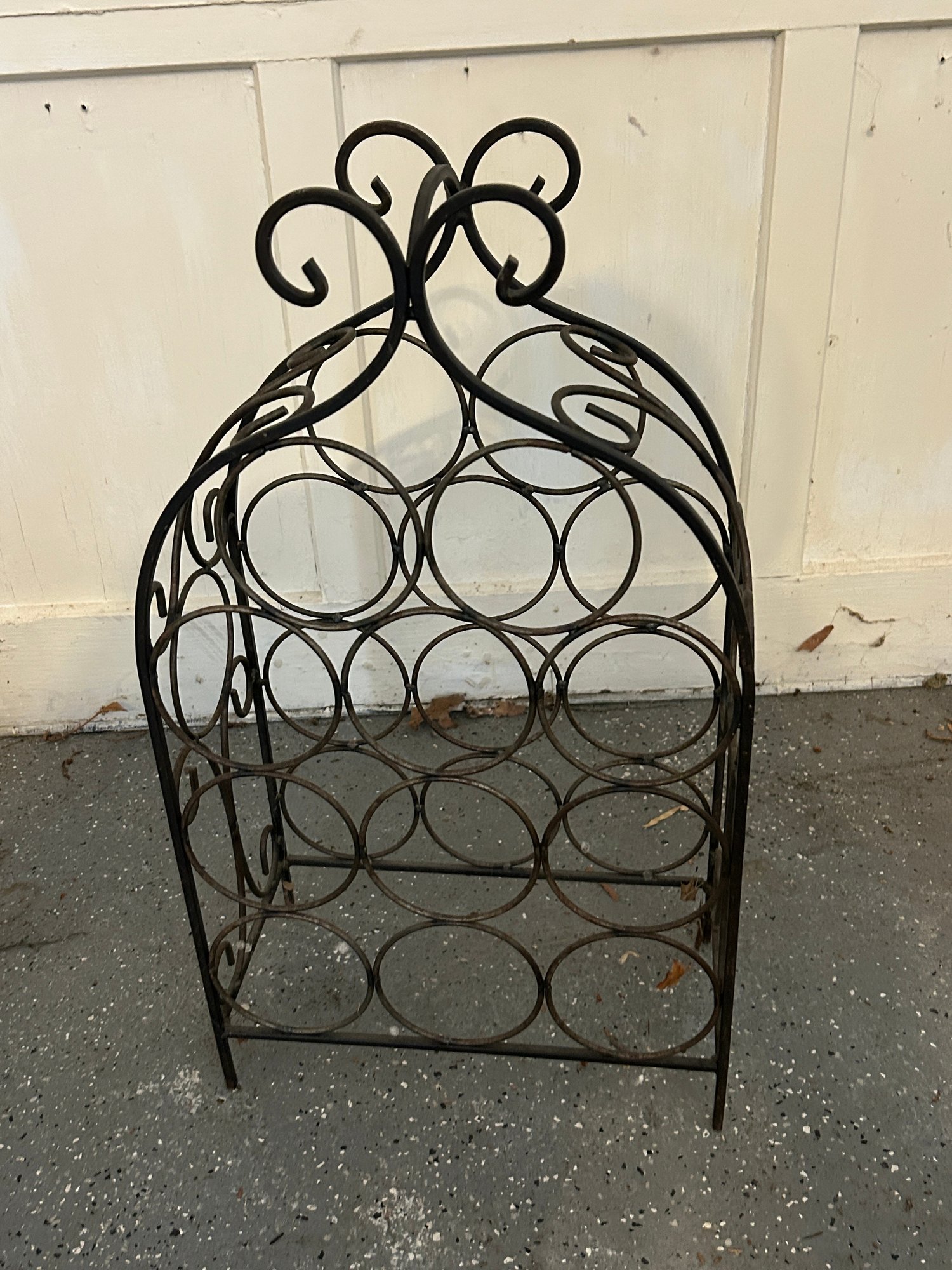 This is a freestanding wine rack crafted from dark-colored metal, likely wrought iron, featuring a decorative scrolled top. It is designed to hold multiple bottles within a grid of circular compartments. The rack exhibits a rustic aesthetic with visible surface wear and some dust.