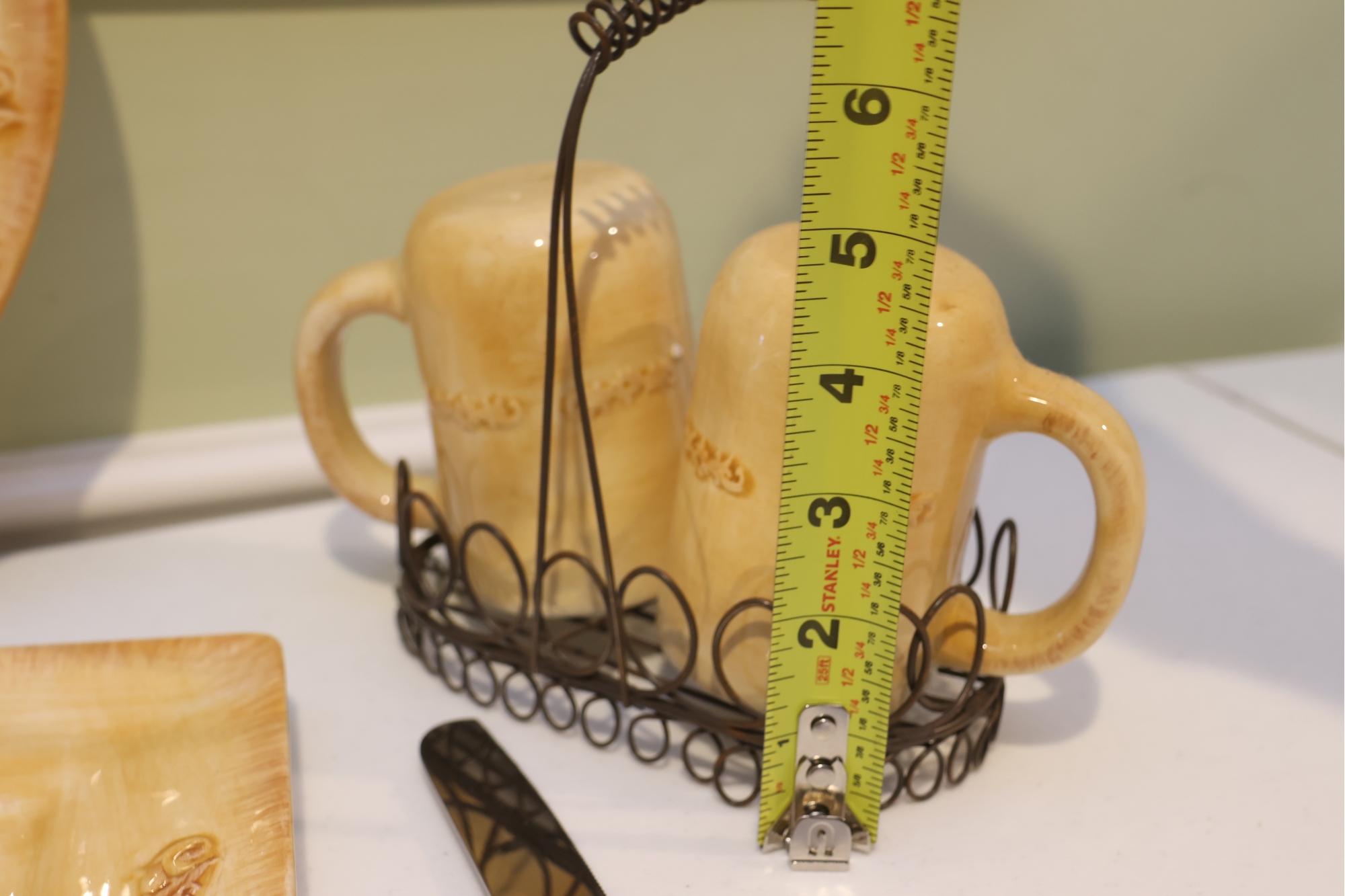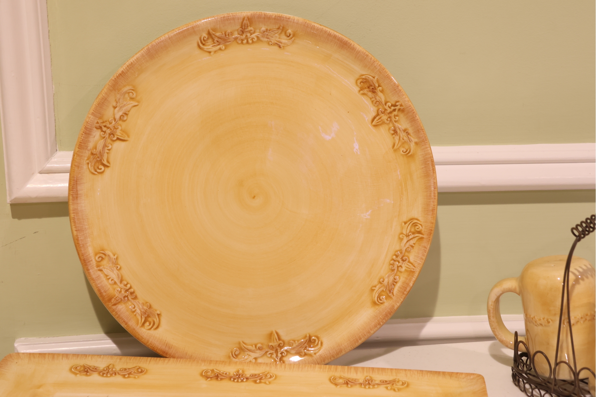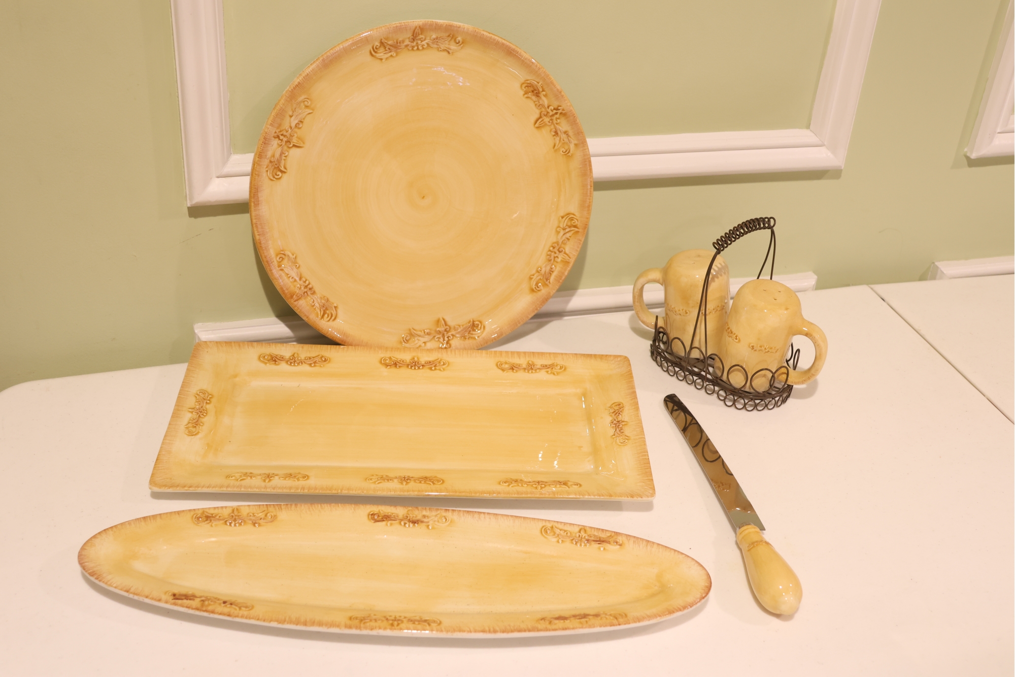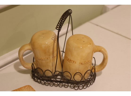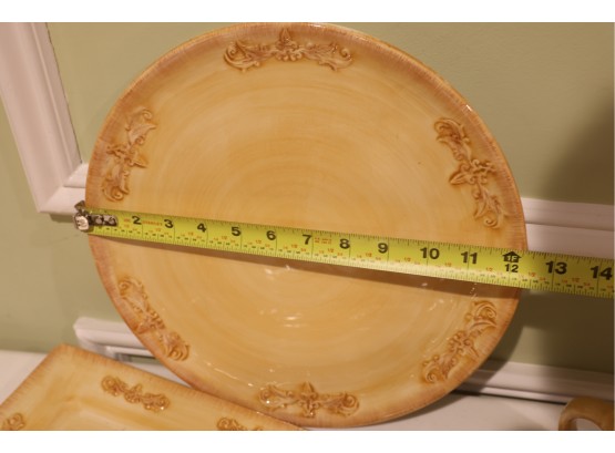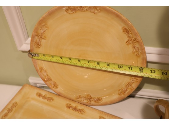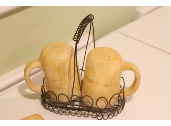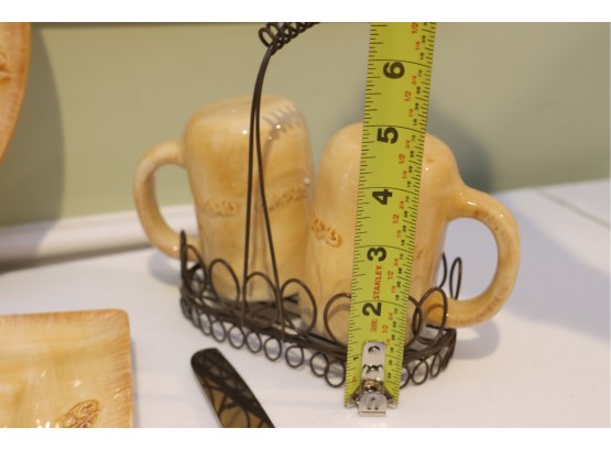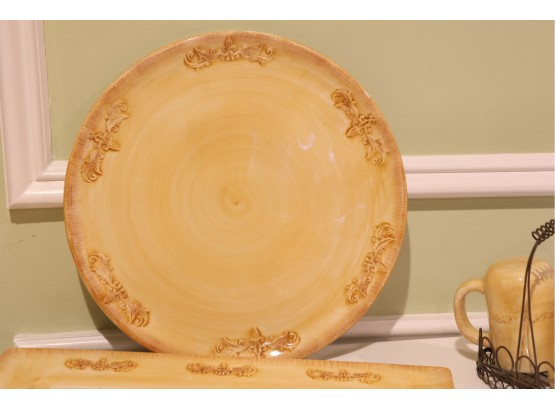 Yellow Glazed Ceramic Serving Ware And Mug Set With Wire Caddy