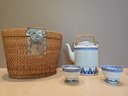 Chinese Blue & White Porcelain Tea Set in Wicker Basket #112
