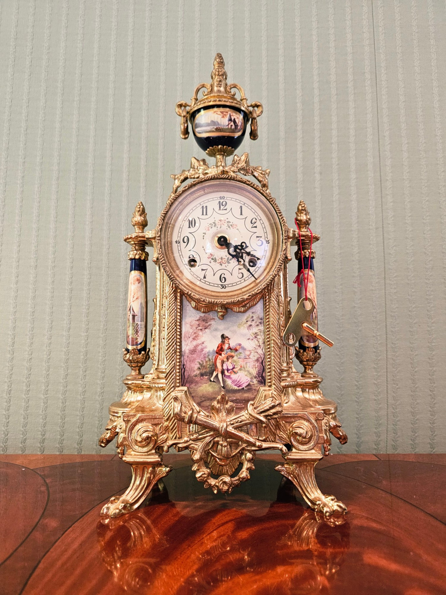 Franz Hermle Lancini Ormolu Porcelain Gilt Brass Mantle Clock With Key Signed - Excellent Condition #4