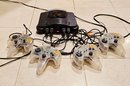 Nintendo 64 Console With Four Controllers And One Game- Tested for power, device turns on when plugged in. Not tested with actual gameplay #228