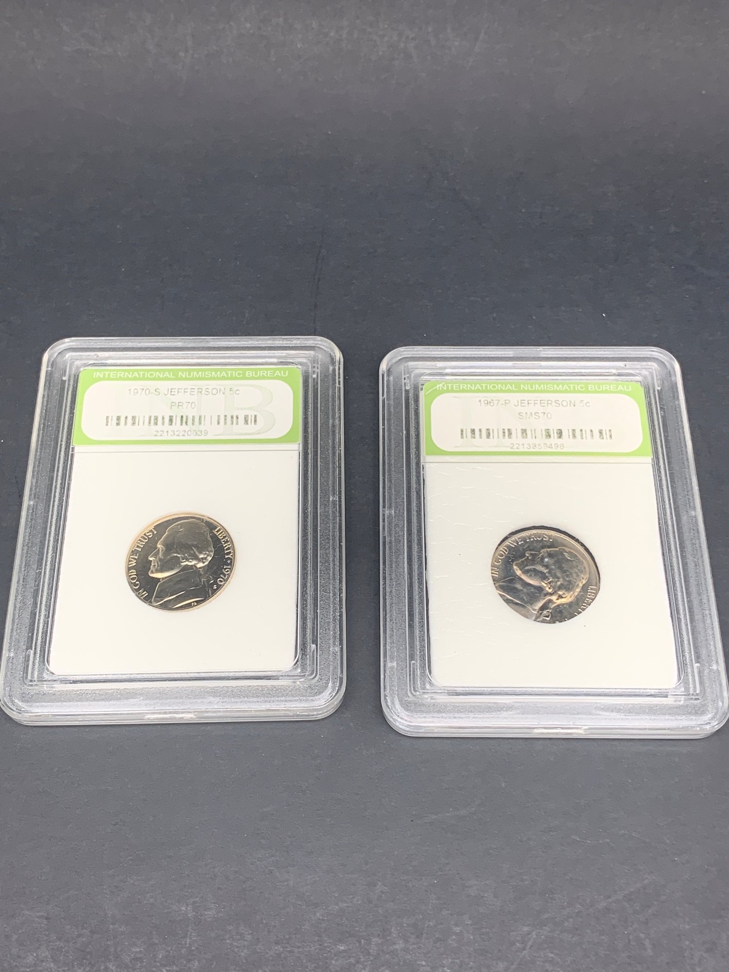 1967-P Jefferson 5c, Nickel, SMS70 & 1970-S Jefferson 5c, Nickel, PR70, International Numismatic Bureau