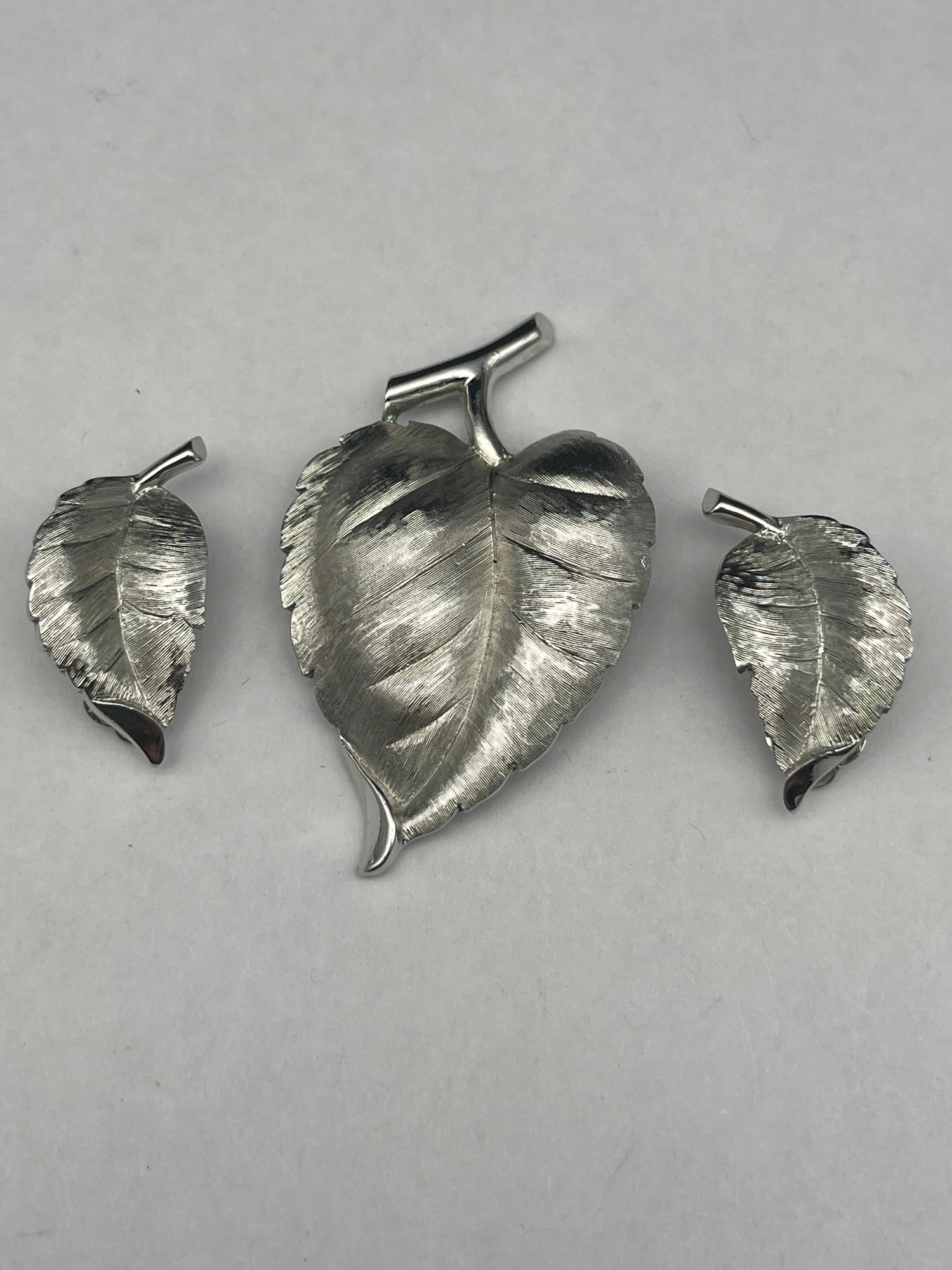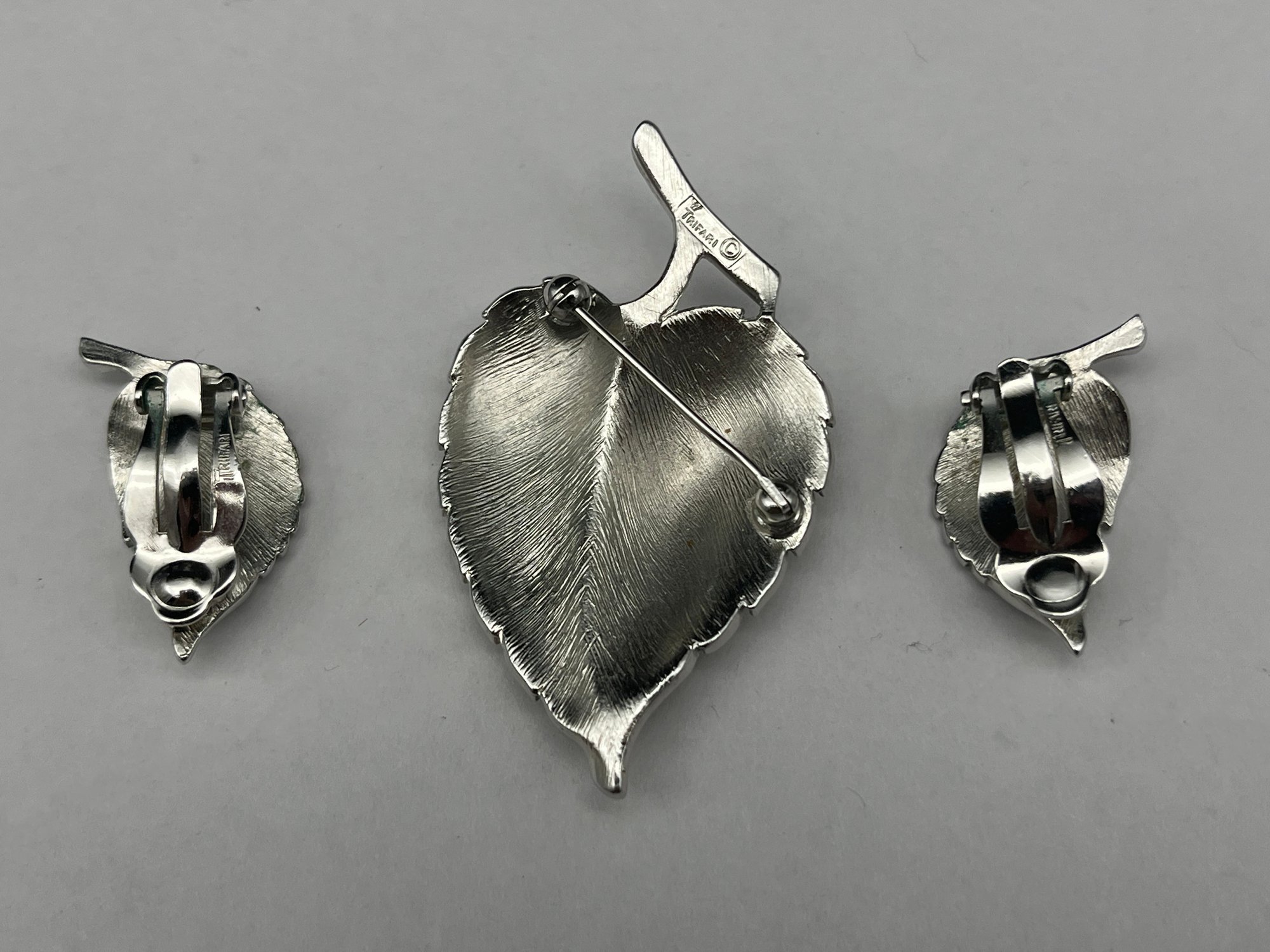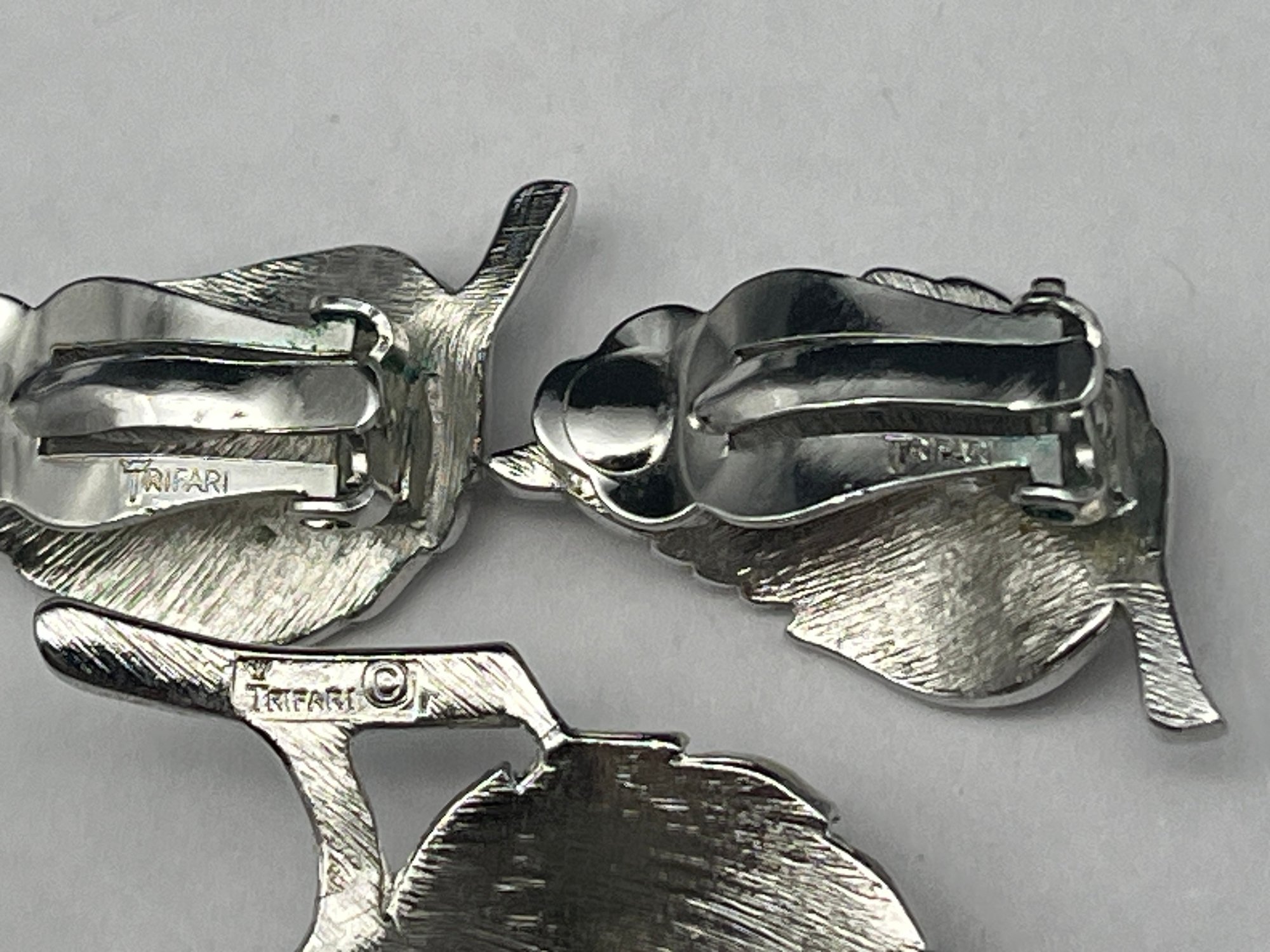 1970s Crown TRIFARI Brushed Silver Toned Leaf Motif Brooch And Clip On Earrings Set, Brooch 2"