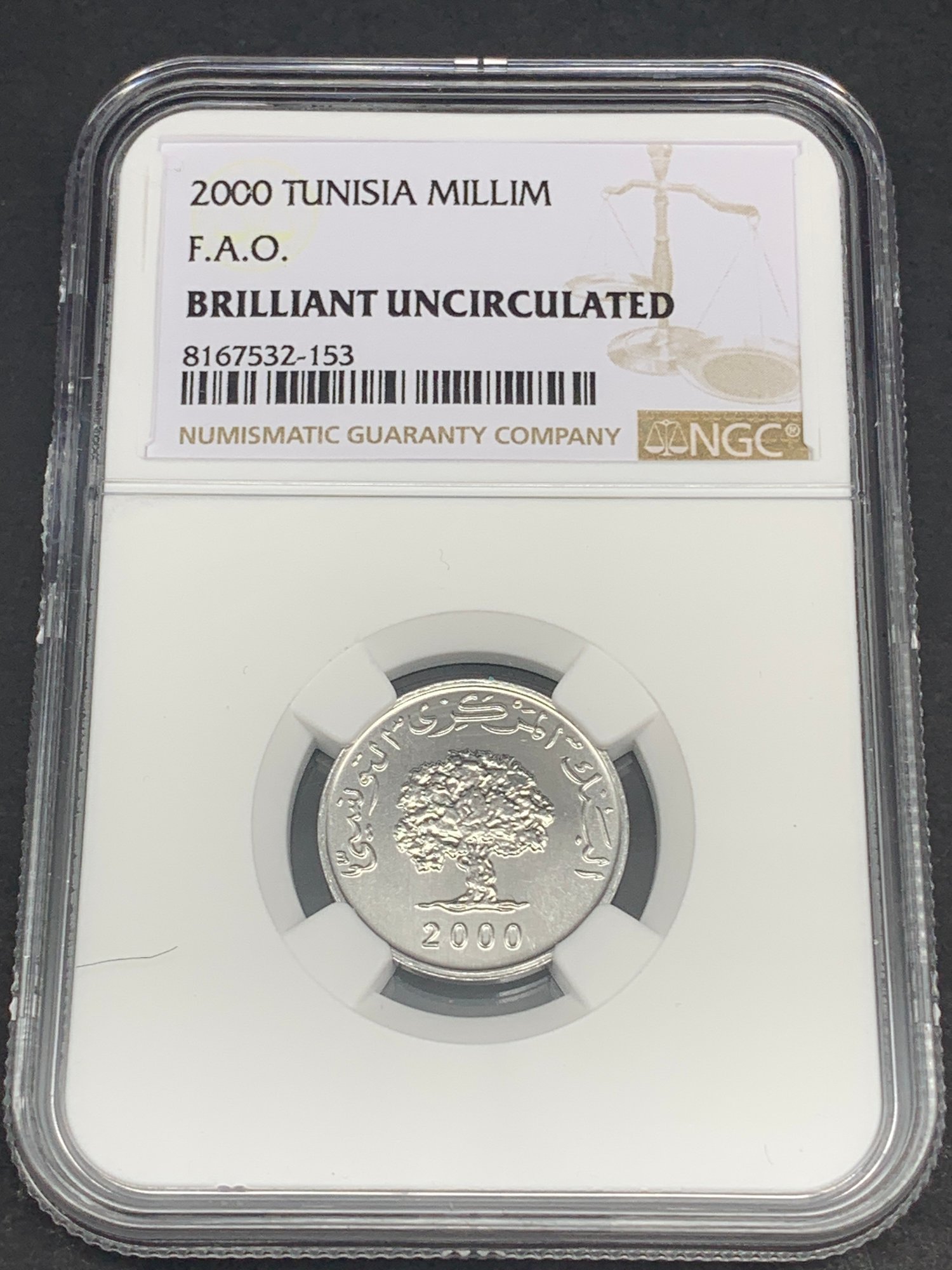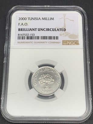 2000 Tunisia 1 Millim Coin, Brilliant Uncirculated By NGC, Commemorative Food & Agriculture Org