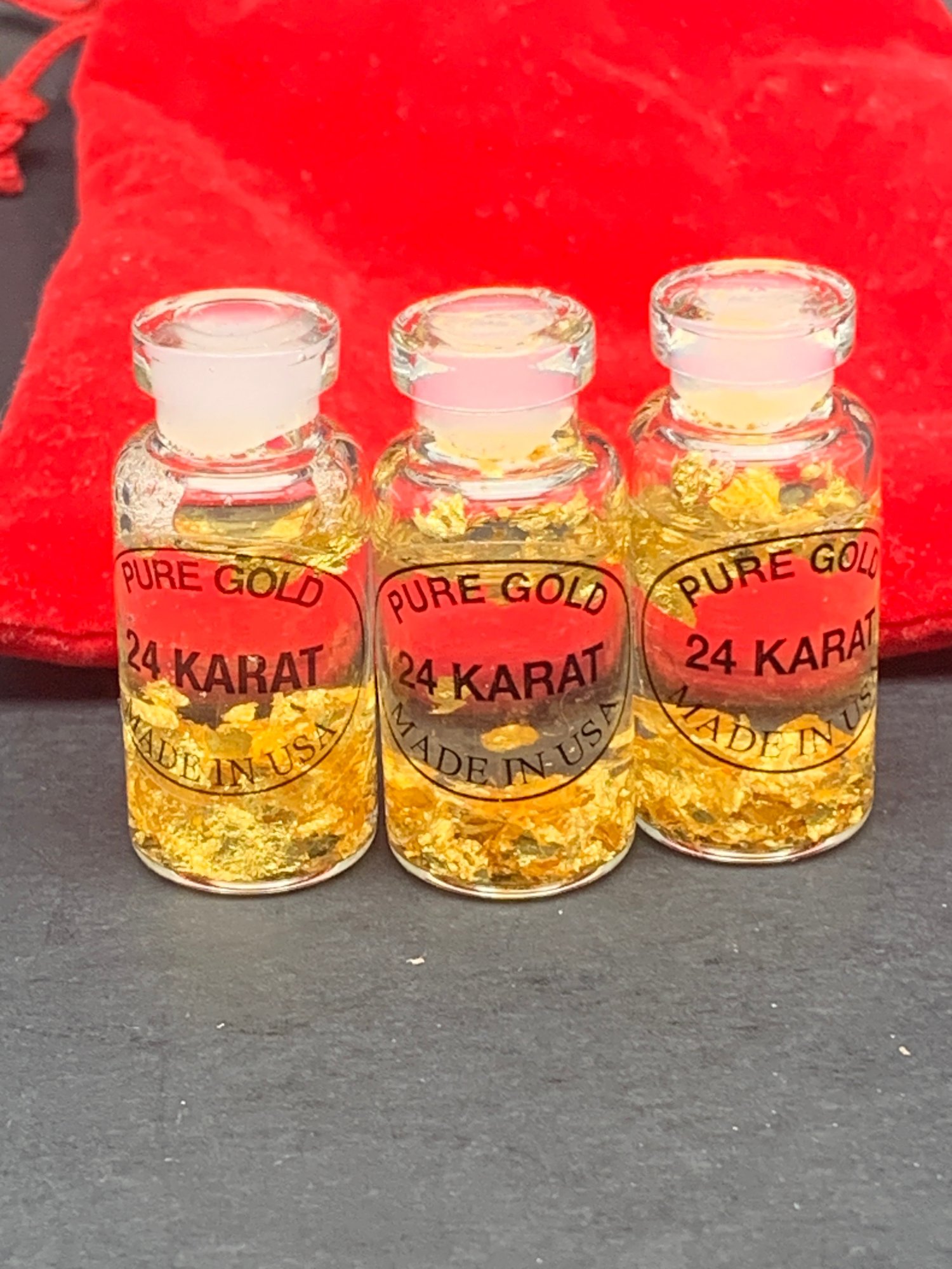 3 Glass Vials With 24K Pure Gold Flake, Red Velvet Drawstring Pouch, Vials 1.5" With Stopper