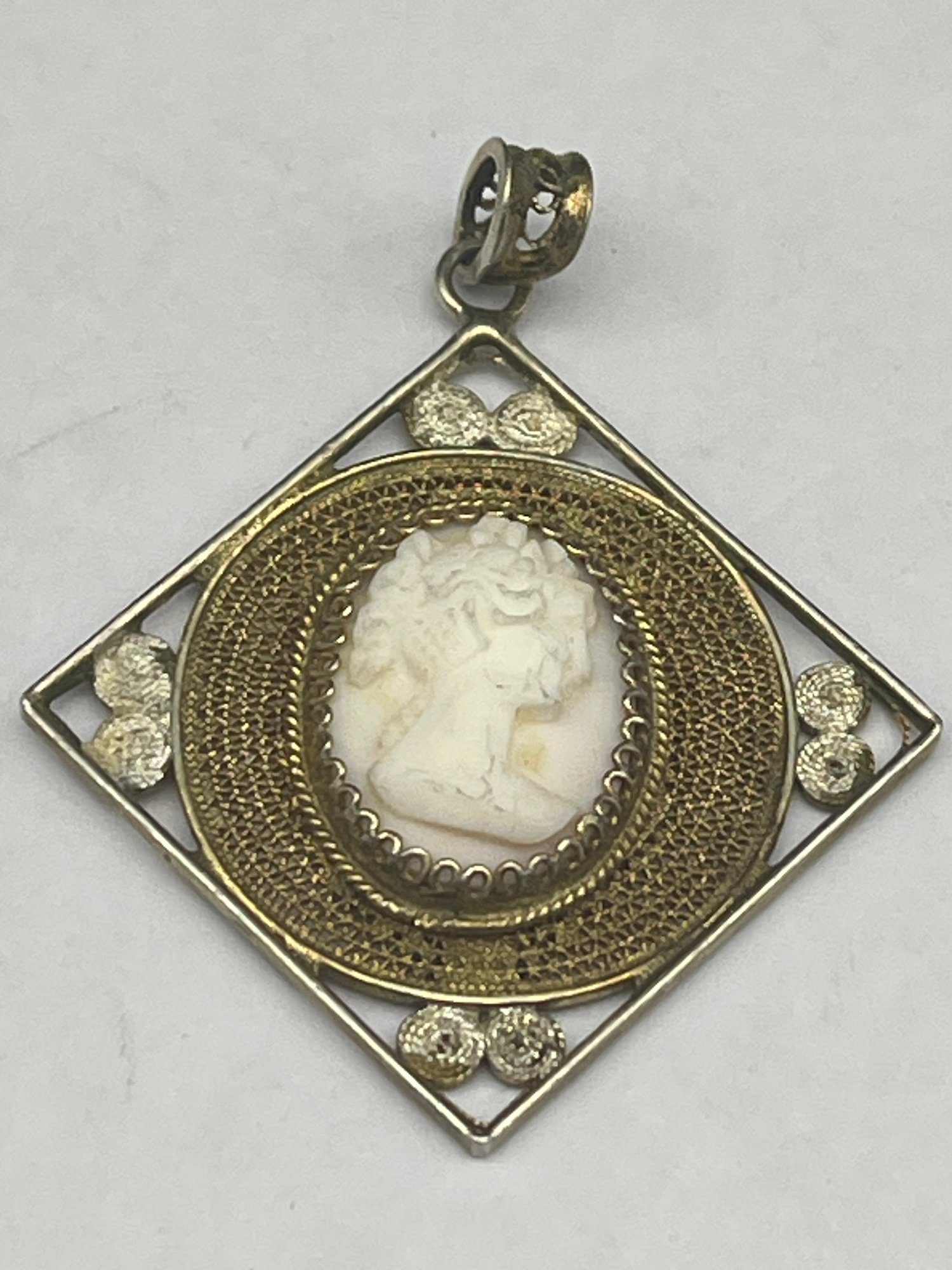 800 Silver Two Toned Carved Shell Cameo Square Pendant, Thin Wire Metal Work, 1"
