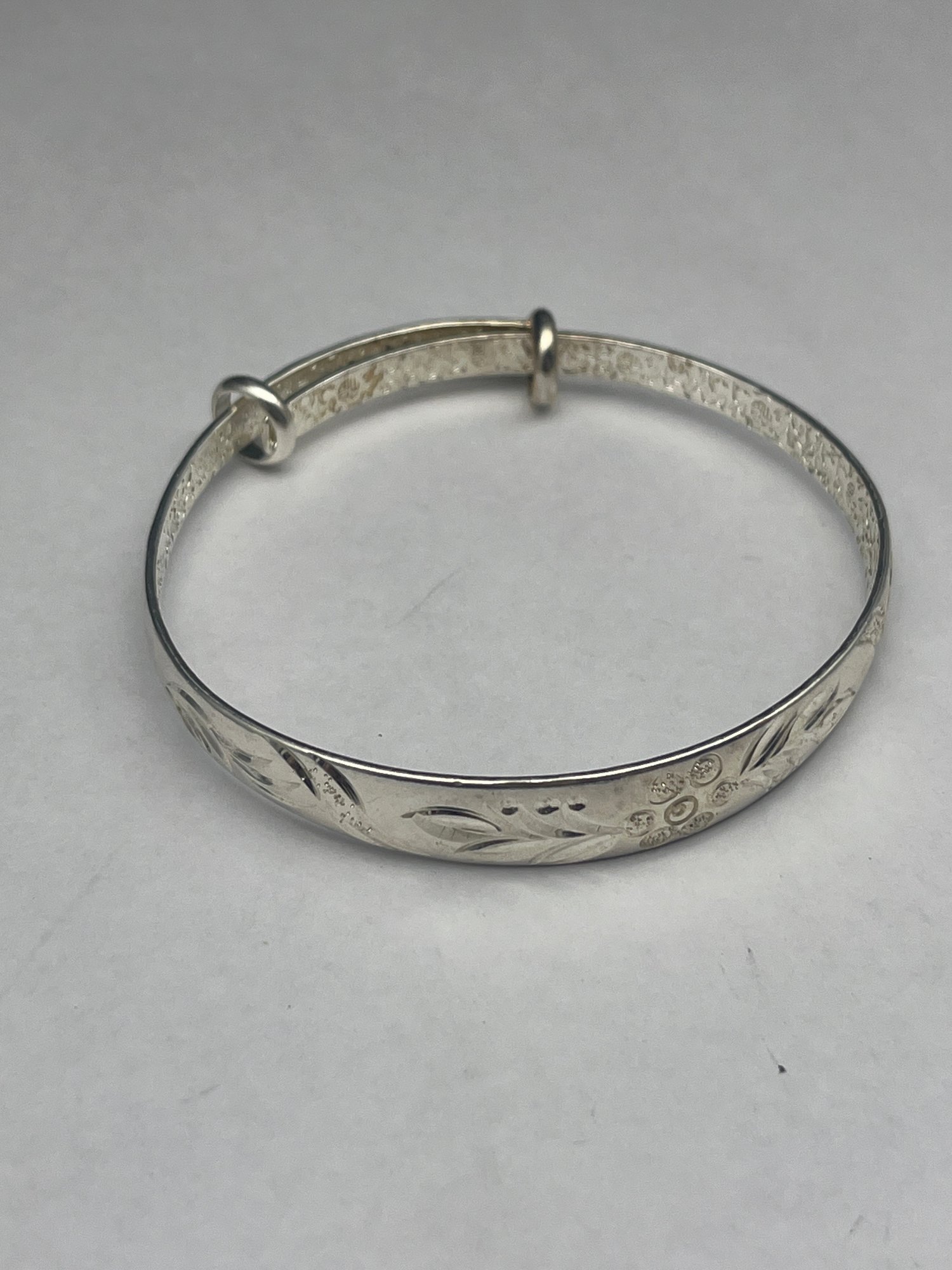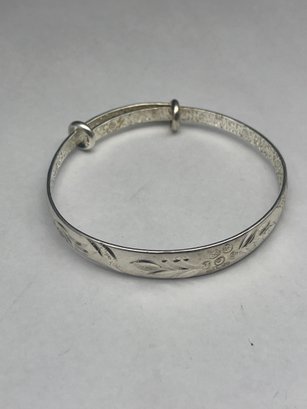 .999 Fine Silver Vintage Asian Floral Engraved Adjustable Bangle Bracelet, 2.5", Chinese Markings