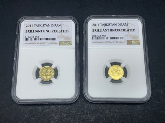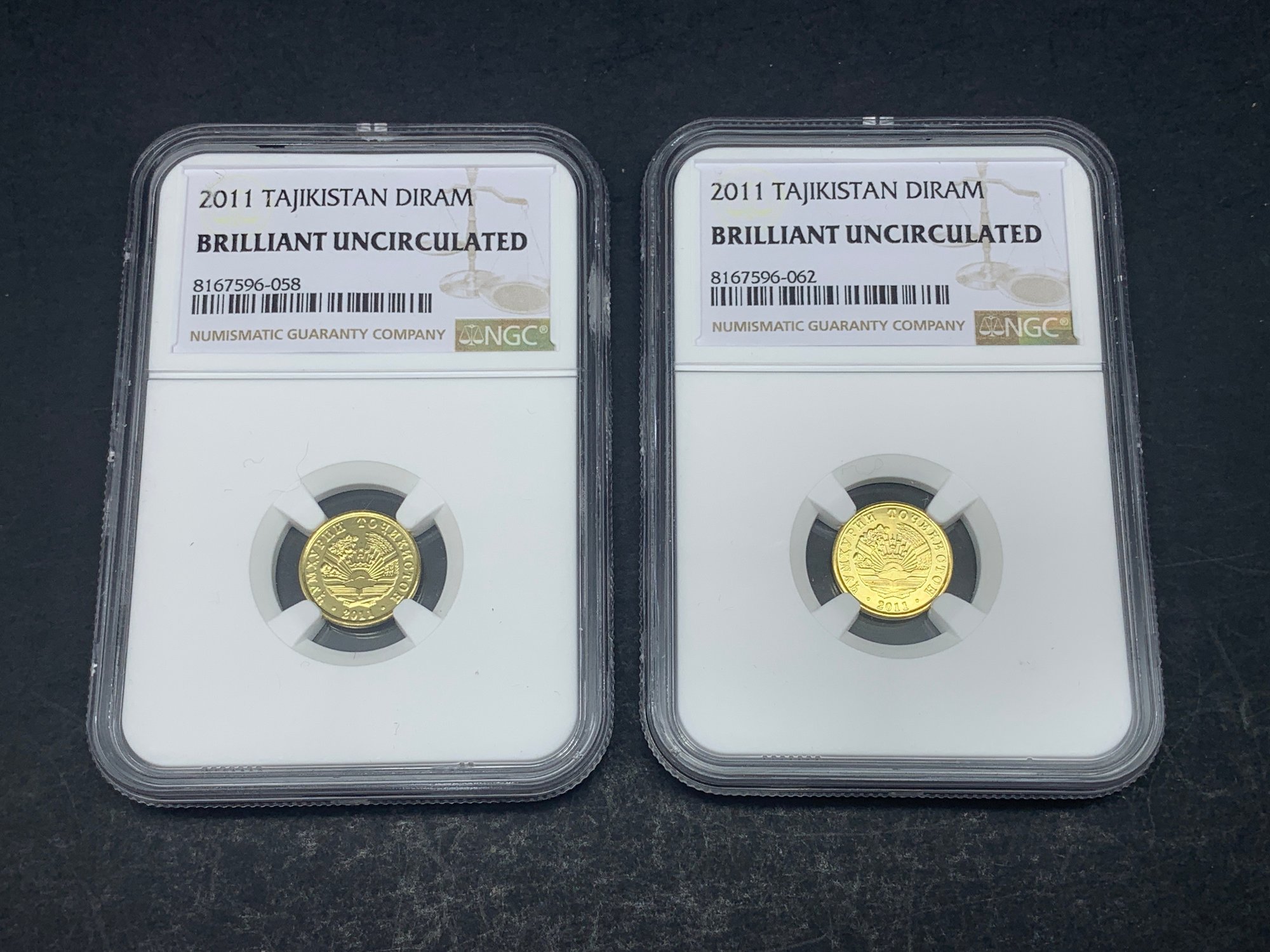 Pair Of 2011 NGC Graded BU Tajikistan Diram Coins, Brilliant Uncirculated