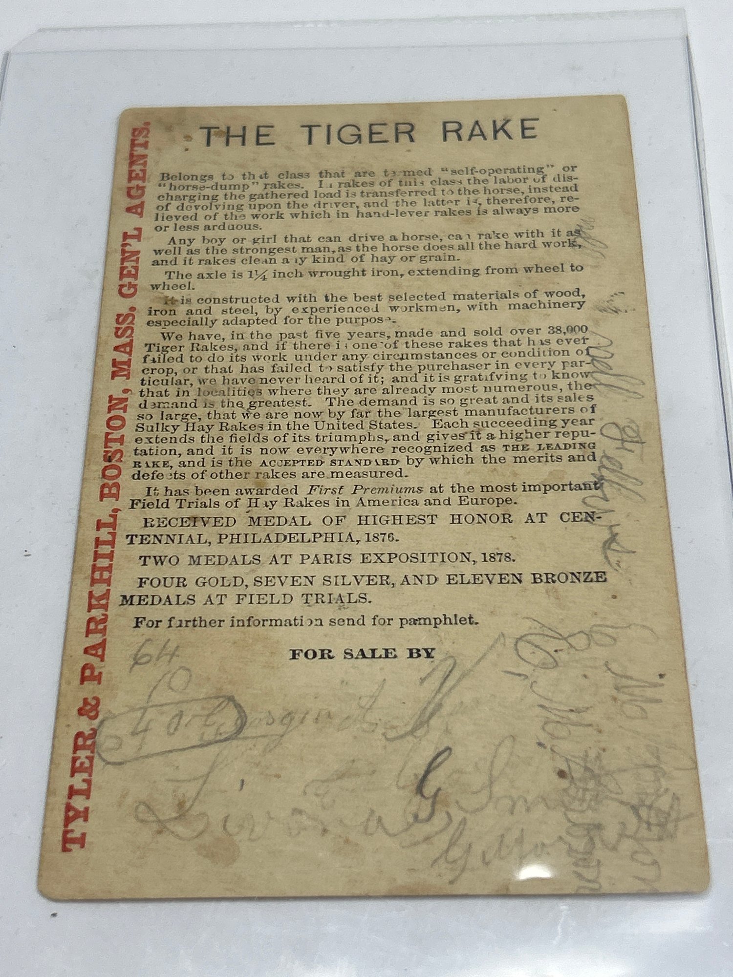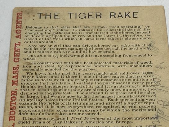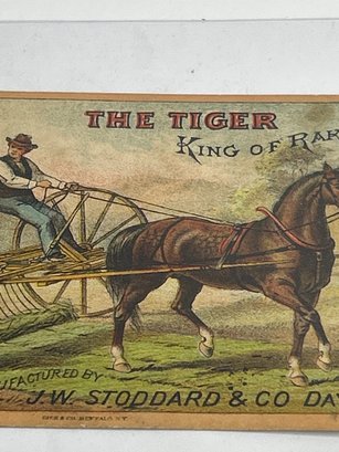 Antique Tiger Rake Farm Equipment Ad, Promotional Trading Card