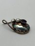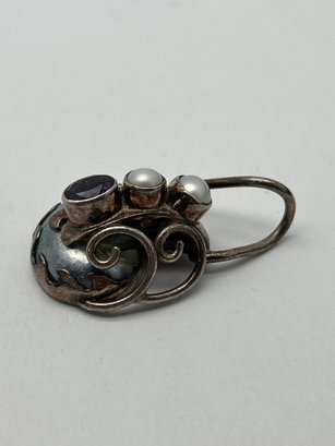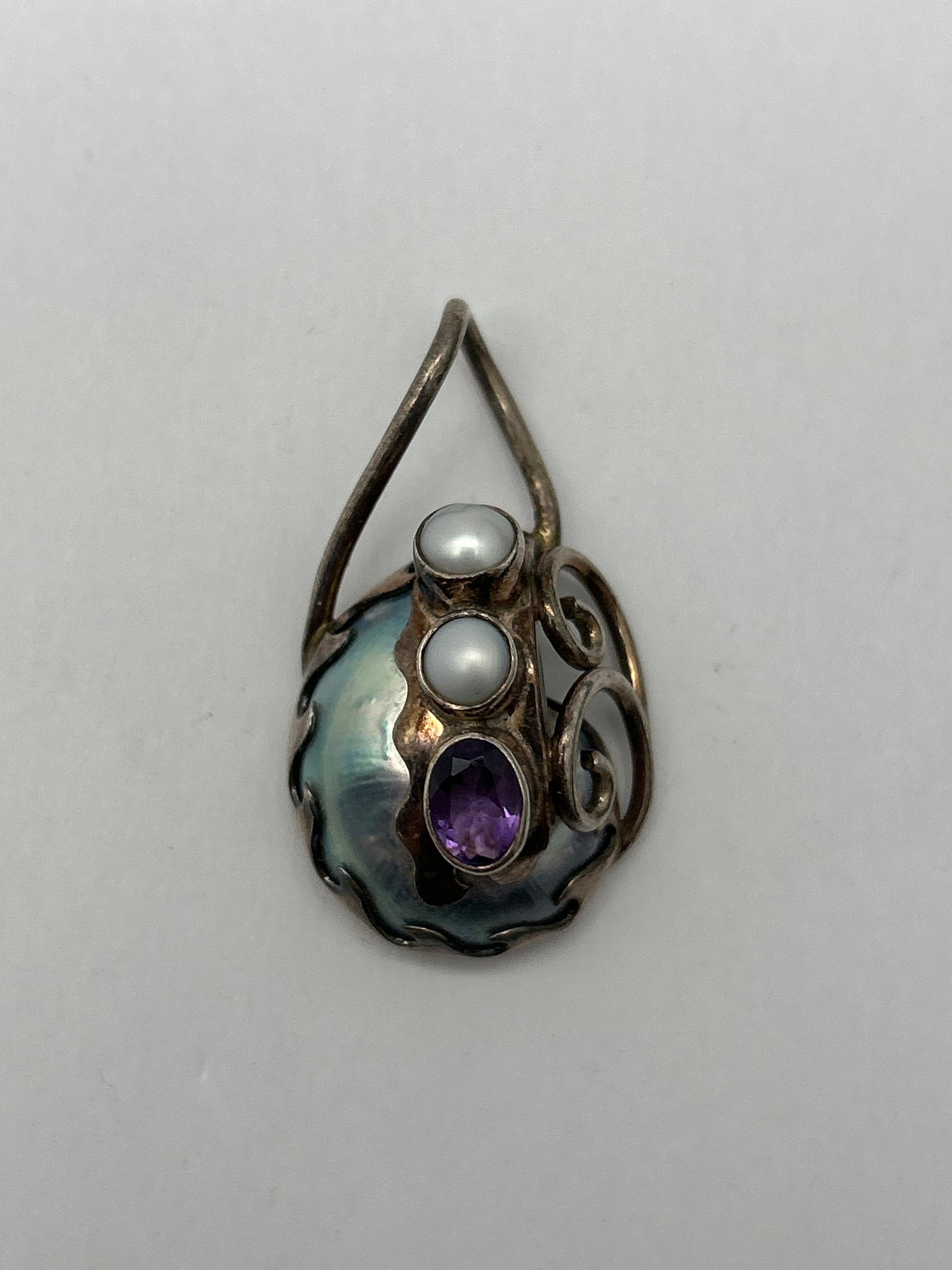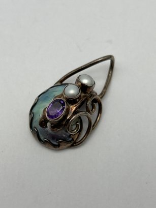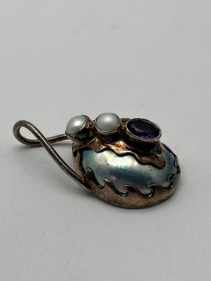 Artisan Made Pearl, Amethyst And Shell Sterling Silver Pendant, Signed, 925