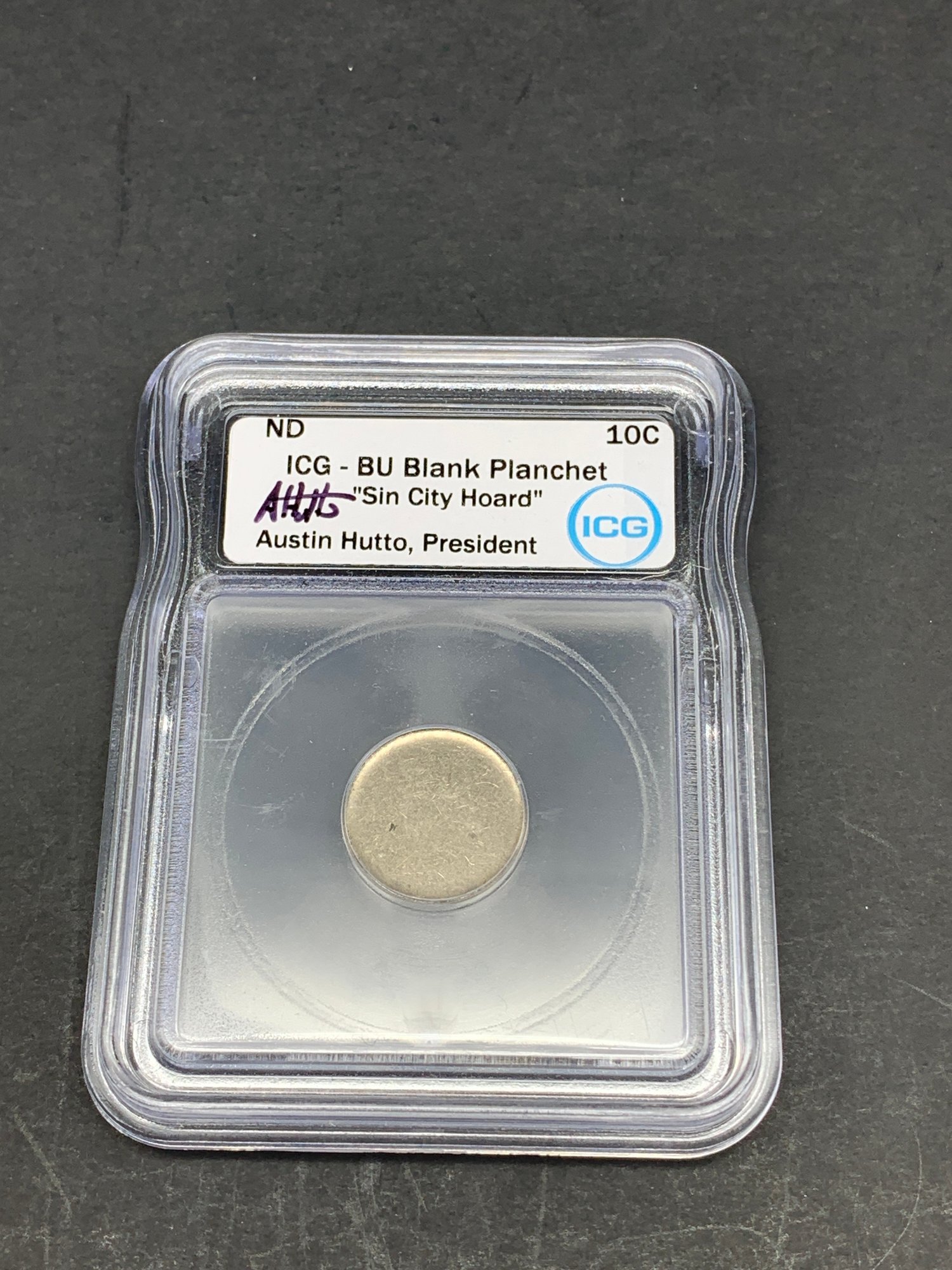 Blank Planchet, 10c, Dime, Sin City Hoard, Brilliant Uncirculated, Signed By Austin Hutto, President, ICG