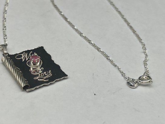 Book Style Pendant With Pink Stone, With Love, Sterling Silver 925 On 19" Thin 925 Figaro Link Necklace