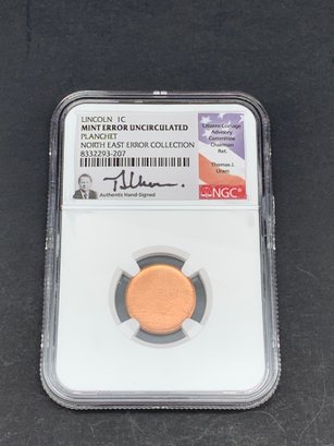 NGC MINT ERROR UNCIRCULATED Lincol Penny, 1c, North East Error Collection, Planchet, Authentic Hand-Signed