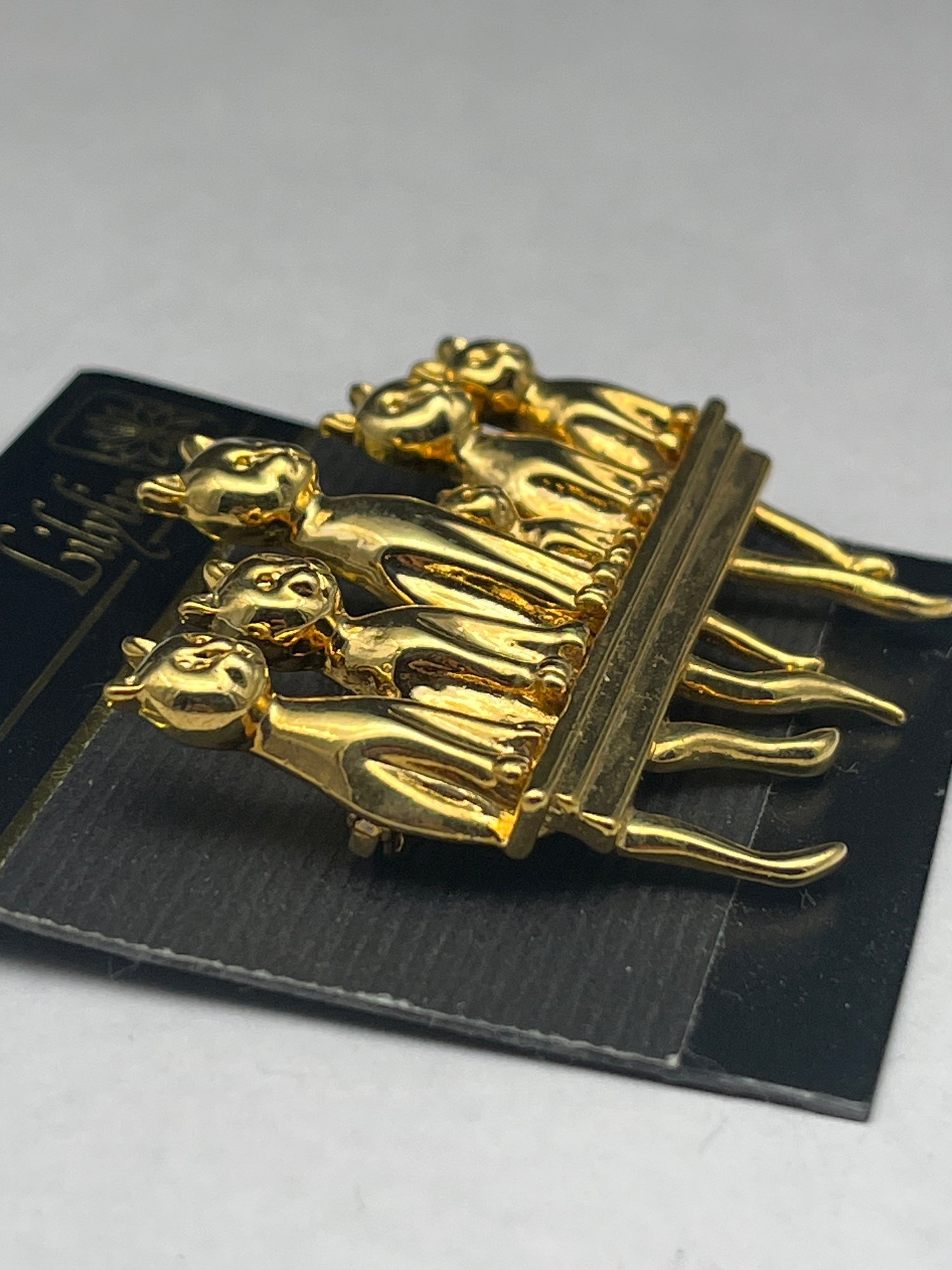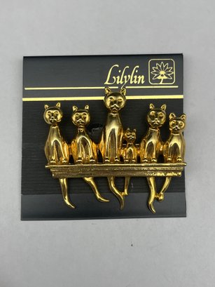 Cats On A Ledge, Perched Cats Brooch, Gold Toned Metal, 2.25" Long