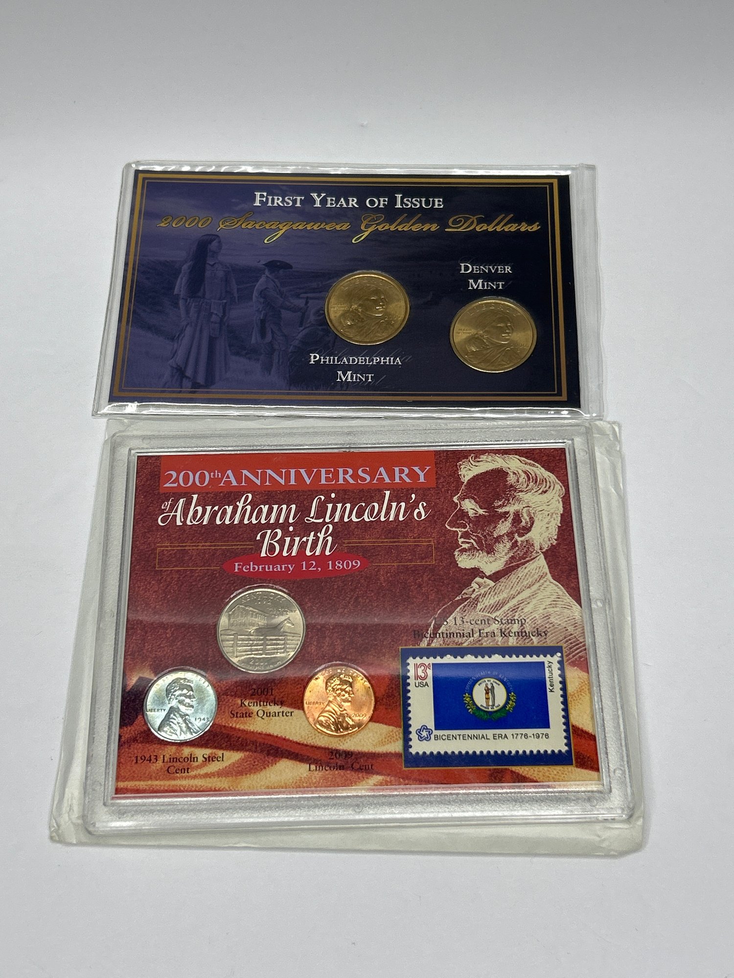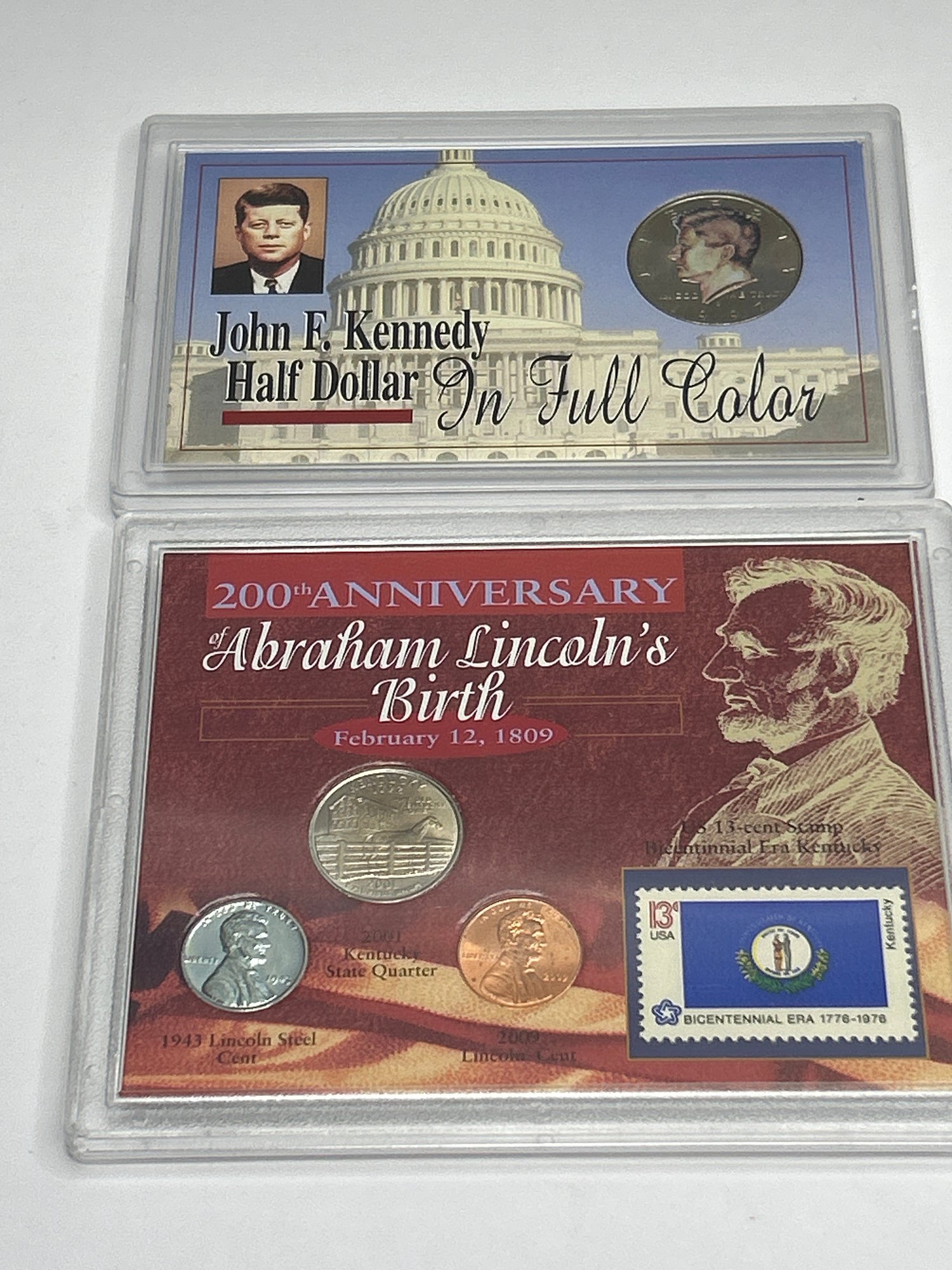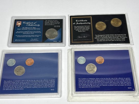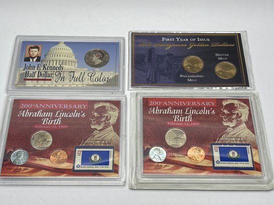 Colorized Kennedy Half Dollar, First Year Issue Sacagawea Golden Dollars And Other Coins In Cases