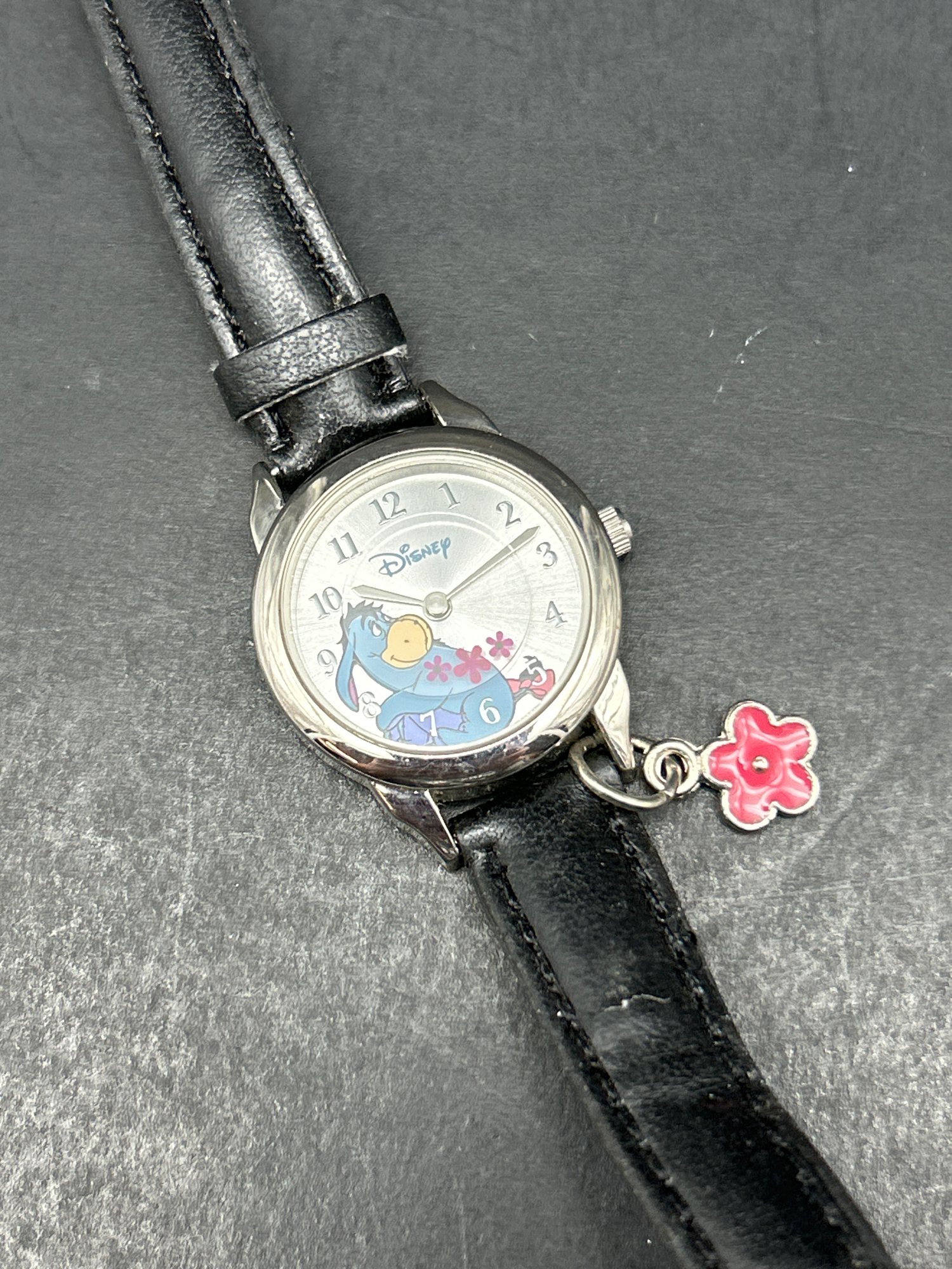 Disney Women's WTP053 Eeyore Black Leather Strap With Flower Charm Watch By SII/Seiko, 7.5", Needs Battery