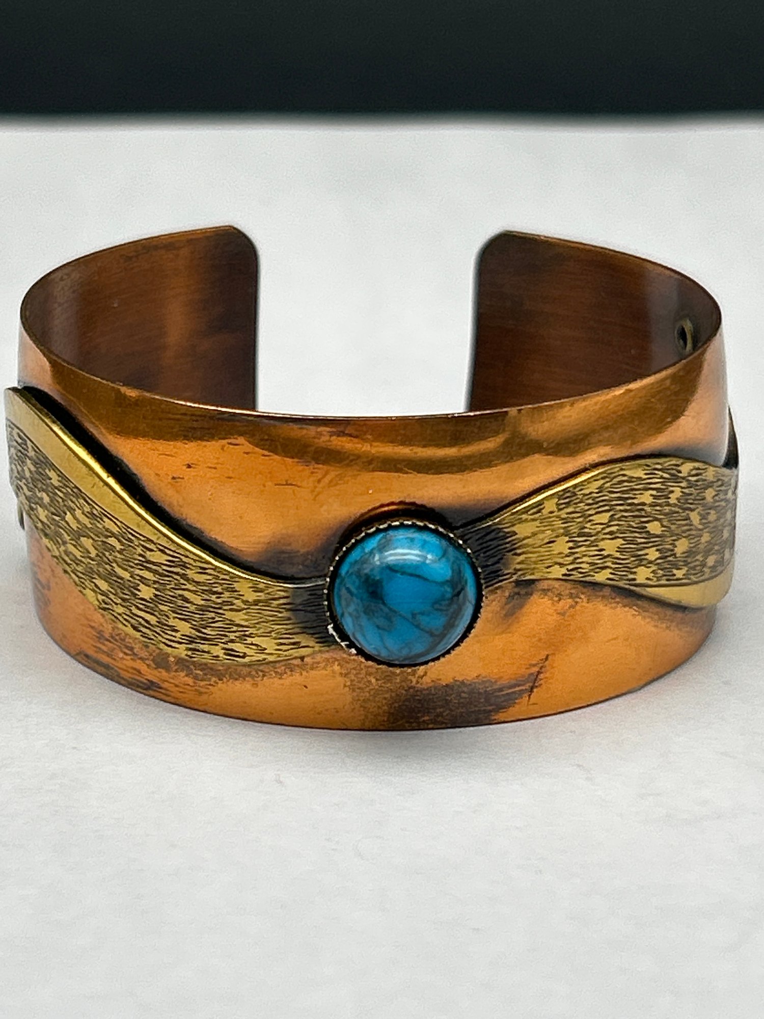 Genuine Copper Cuff Bracelet With Brass Embelishment And Polished Turquoise Stone, 2.25" With 1" Opening