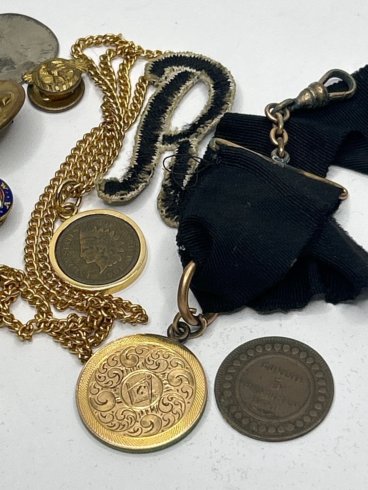Junk Drawer Collection Of Old Items, Military Buttons, Freemason Badge, Coins