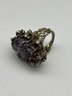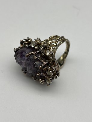 Large Raw Amethyst Crystal And Sterling Silver Ring With Small Clear Stone Accents, Size 7.25