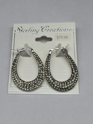 Large Sterling Silver & Black Crystal Hoop Earrings, New On Card, Unworn, 1.25"
