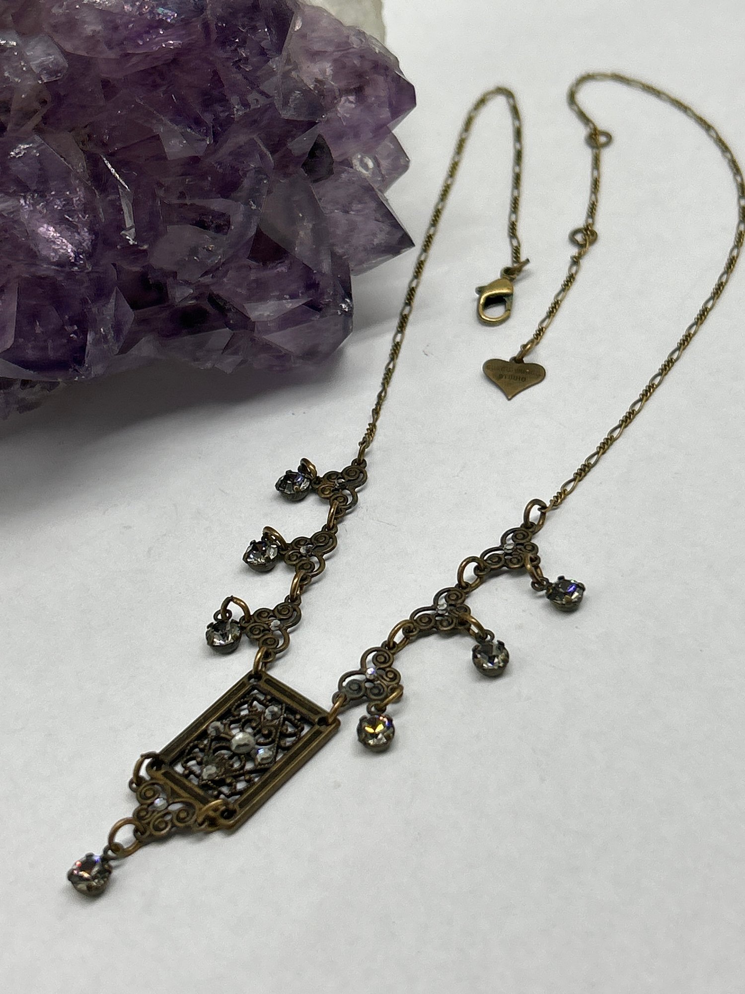 Glass Works Studio Vintage Crystals/Rhinestone Brass Toned Necklace, Scrolling Pendant Design, Figaro Link