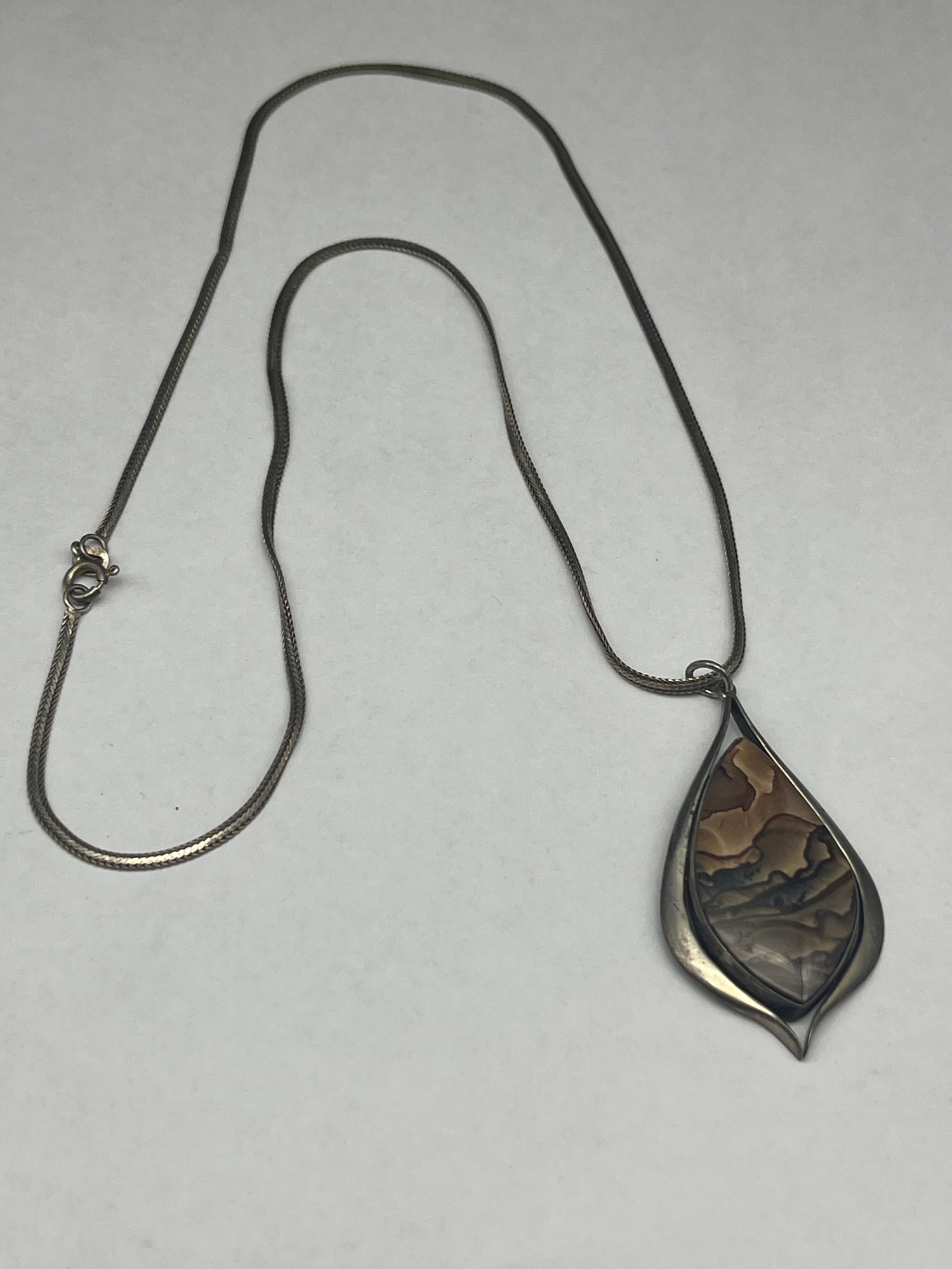 Leaf Shaped Polished Agate Sterling Silver 1.5" Pendant On 18" Sterling Necklace, Marked 925 Italy