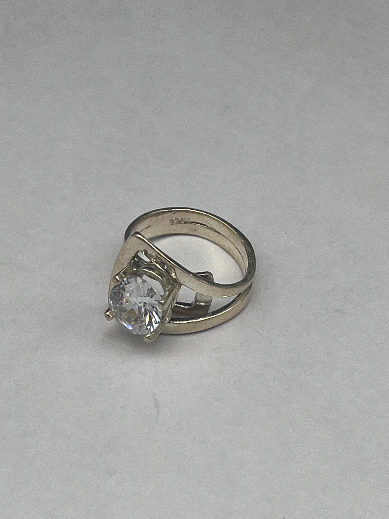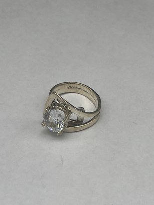 Modernist Sterling Ring With Oval Faceted Solitaire Stone, Basket Setting, Adjustable Band, Size 7, Marked 925