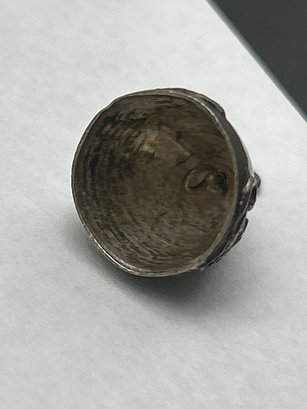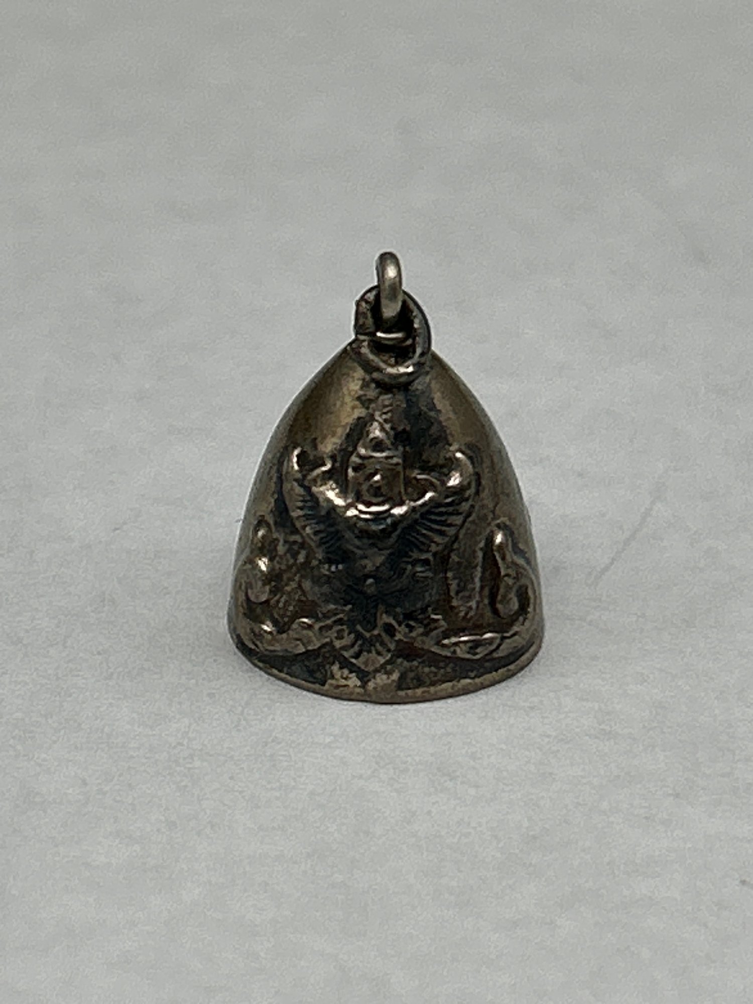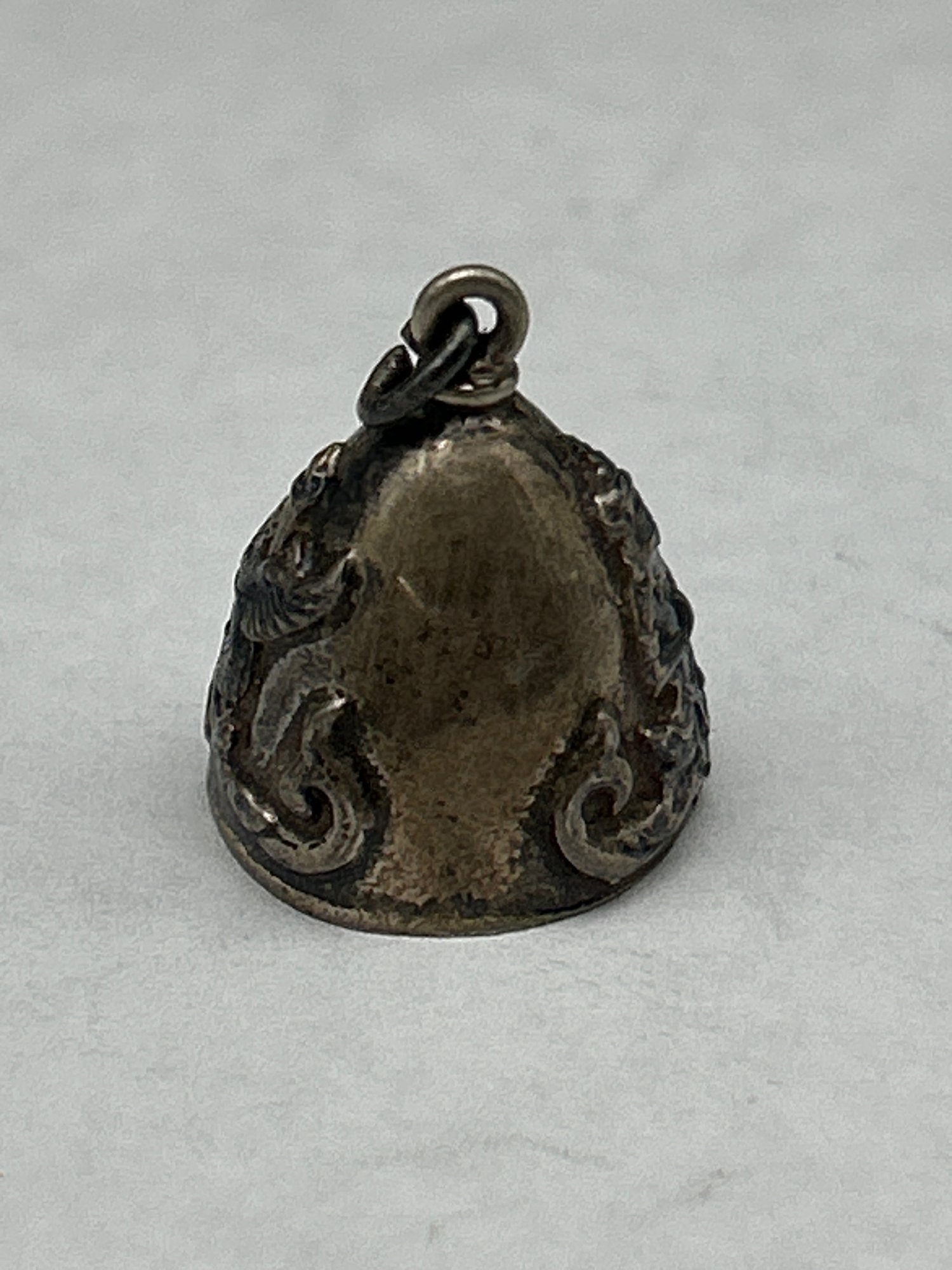 Old Sterling Silver Bell Charm With Double Sided Relief Of Winged God / Idol, Missing Clapper, 3/4"