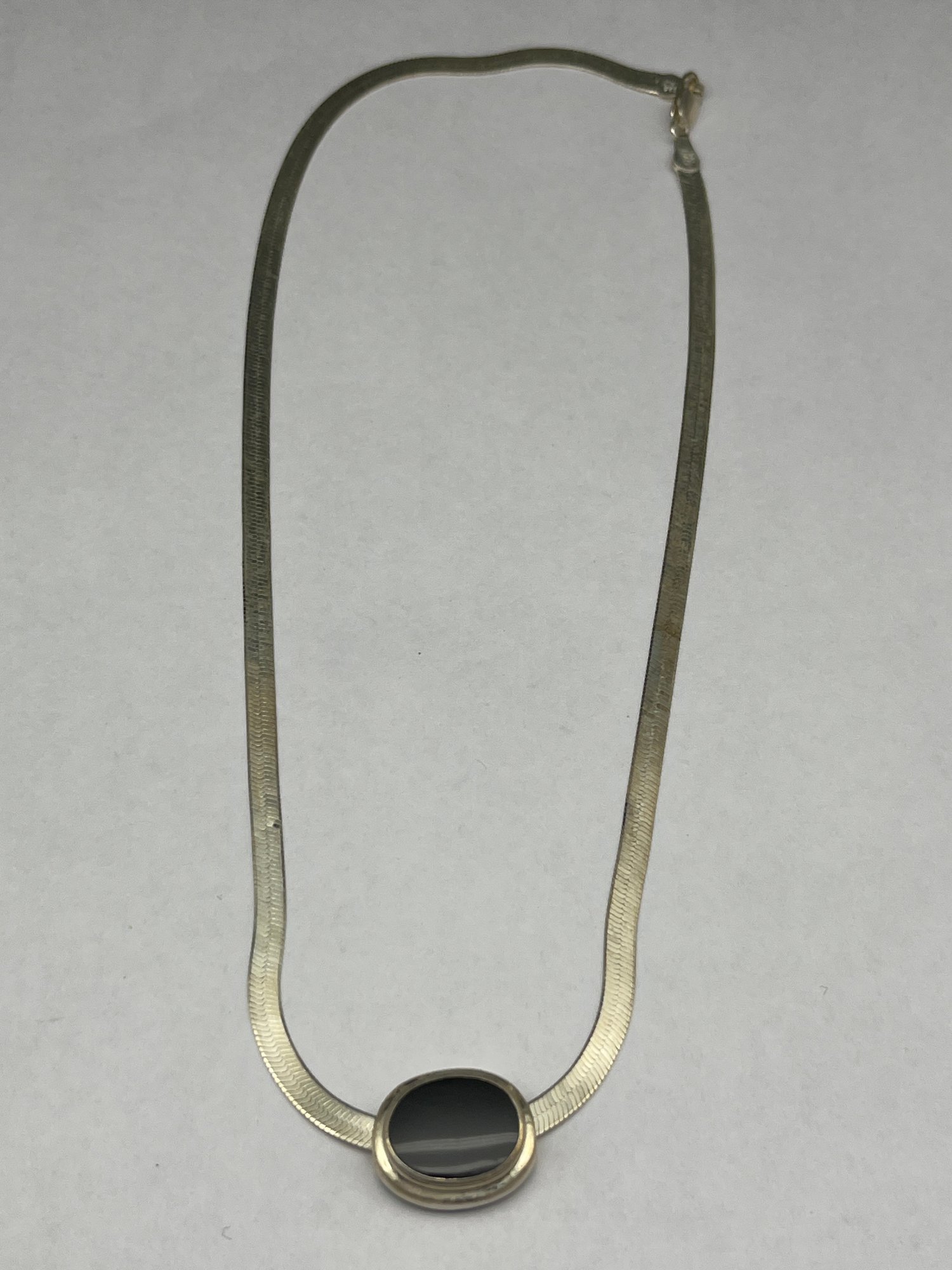 Silver Herringbone Necklace With Black Onyx 3/4" Slider Charm, Marked 925 Italy, 18"