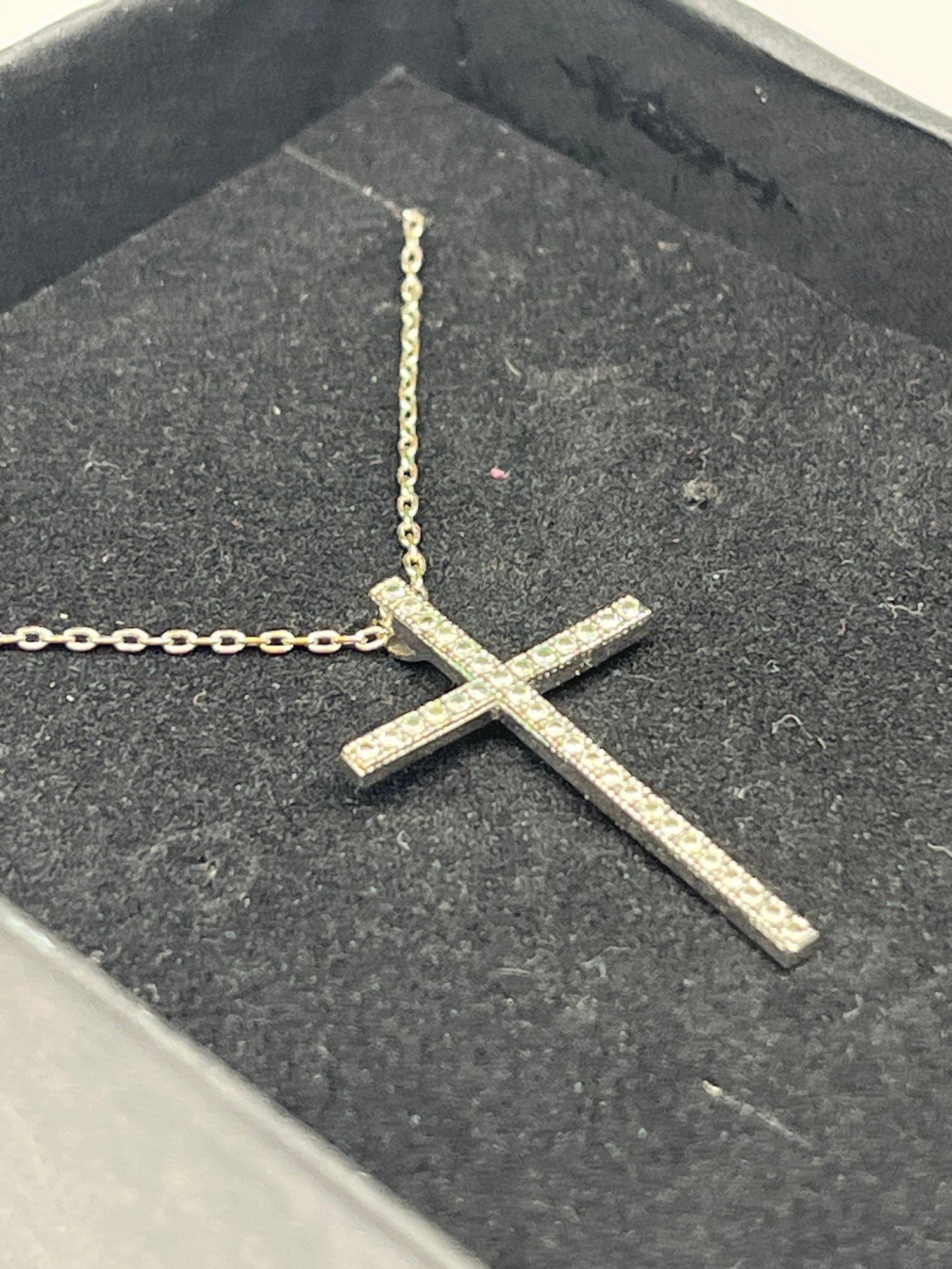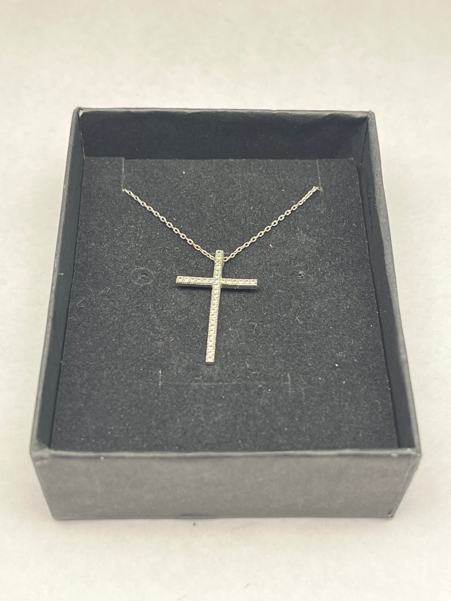 Simple Cross Pendant With Clear Stones, Silver Toned, On Adjustable 16-18" Chain