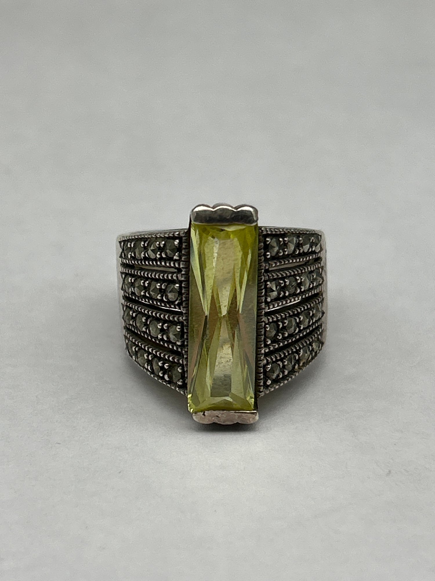 Sterling Silver And Marcasite Ring With Long Green Open Back Rectangular Stone, Marked 925, Size 9