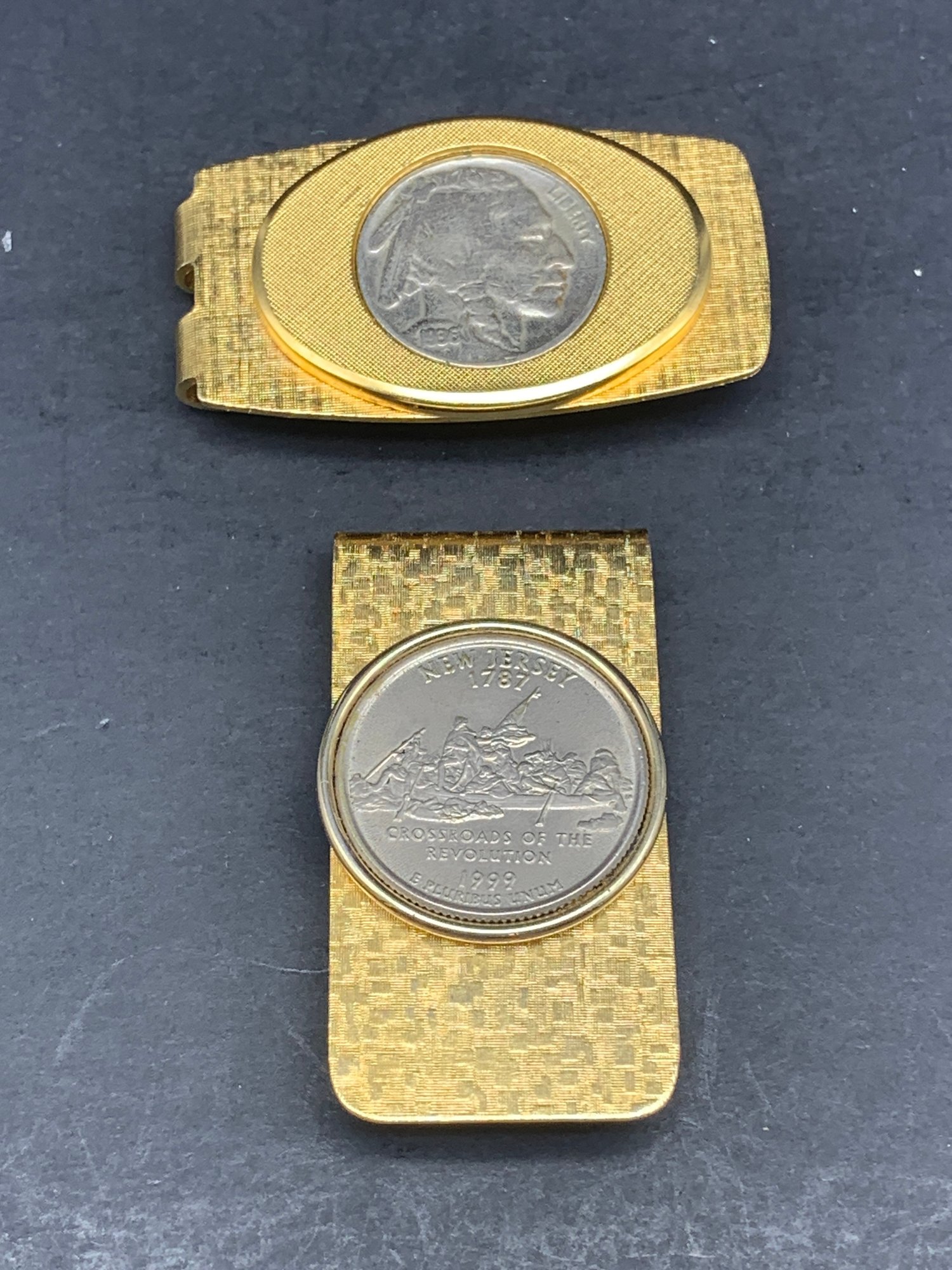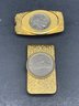 Two Gold Toned Money Clips With US Coins, One Money Clip Signed Anson, Vintage Pieces, Approx 2"