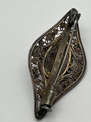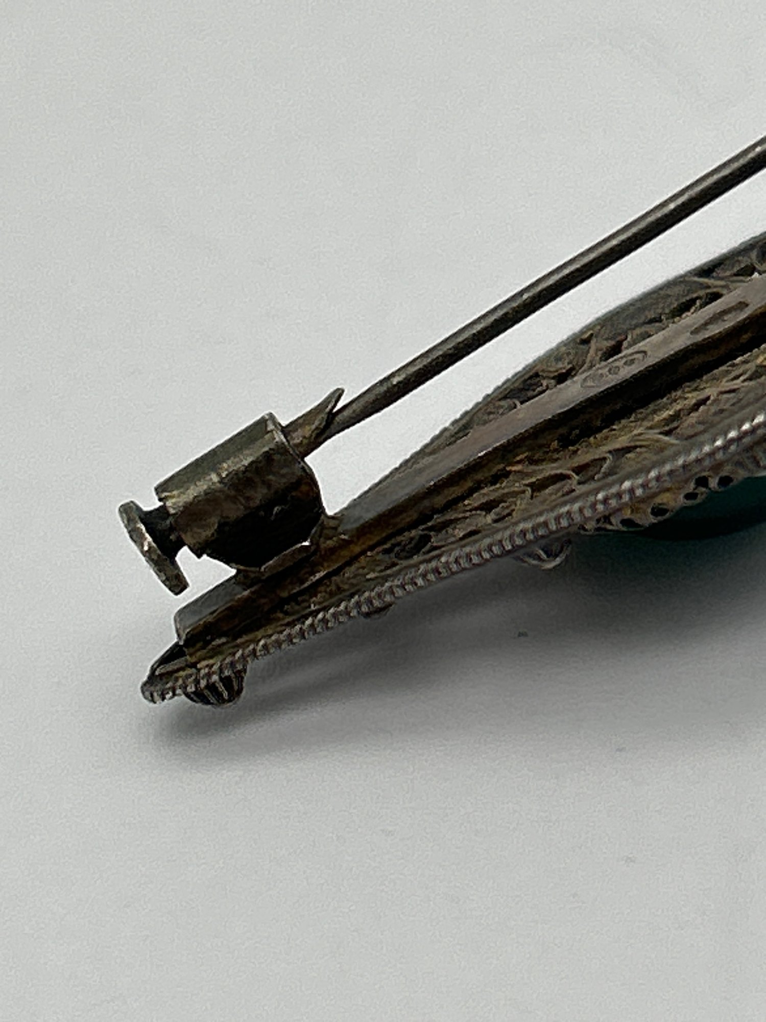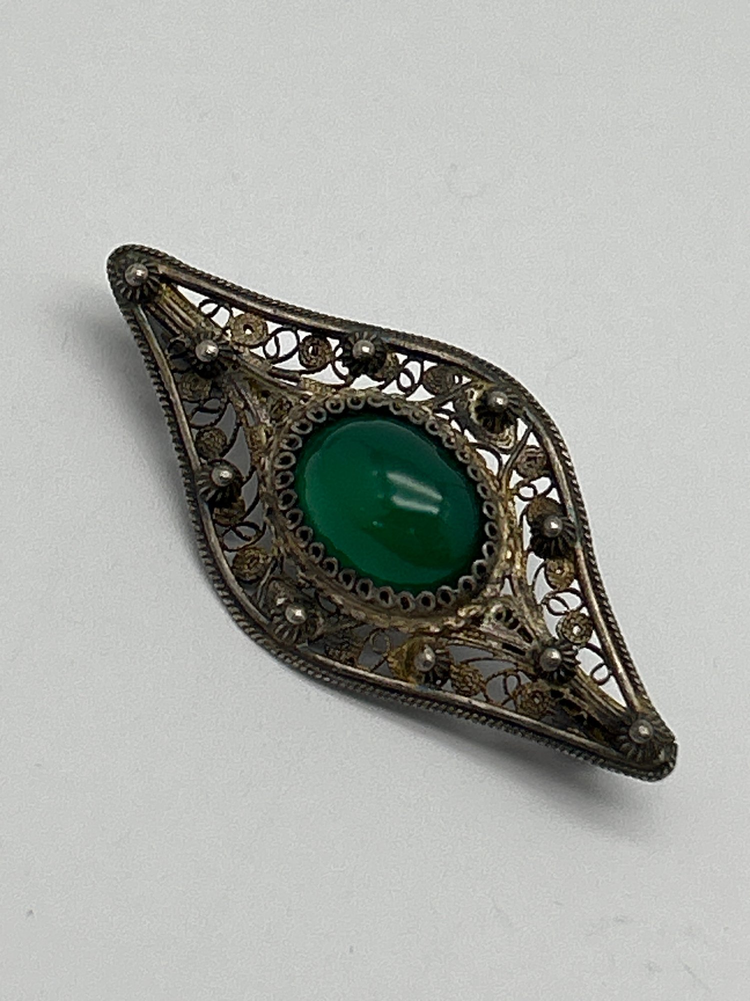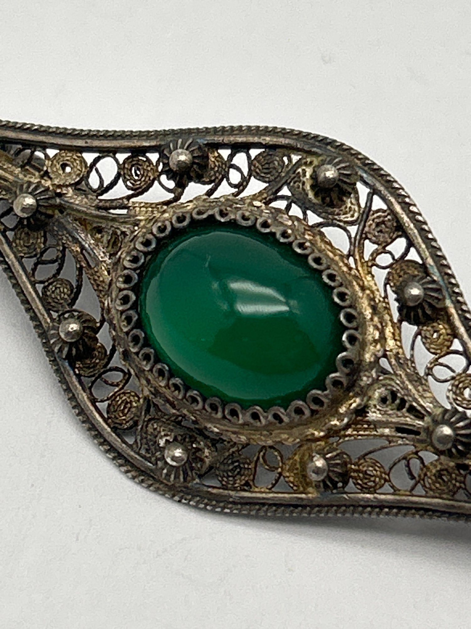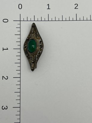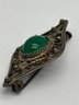 Victorian Brooch 800 Silver With Cabochon Green Greenstone, Lace-Like Metalwork