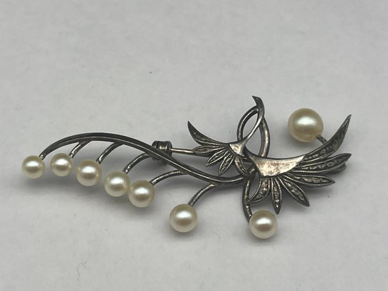 Vintage Sterling Silver Leaf / Vine Design Brooch With Pearls, Marked SILVER, 2.5"