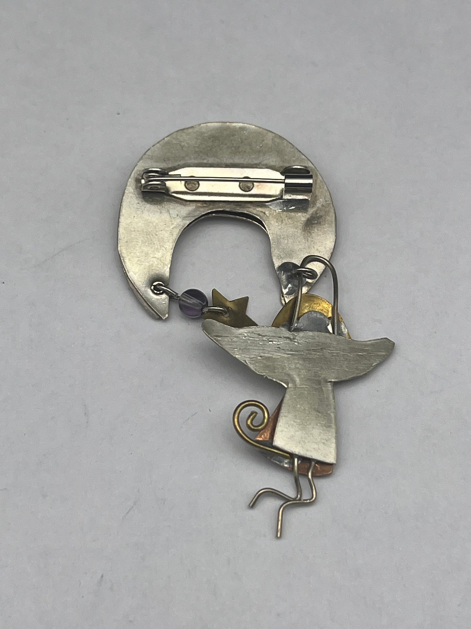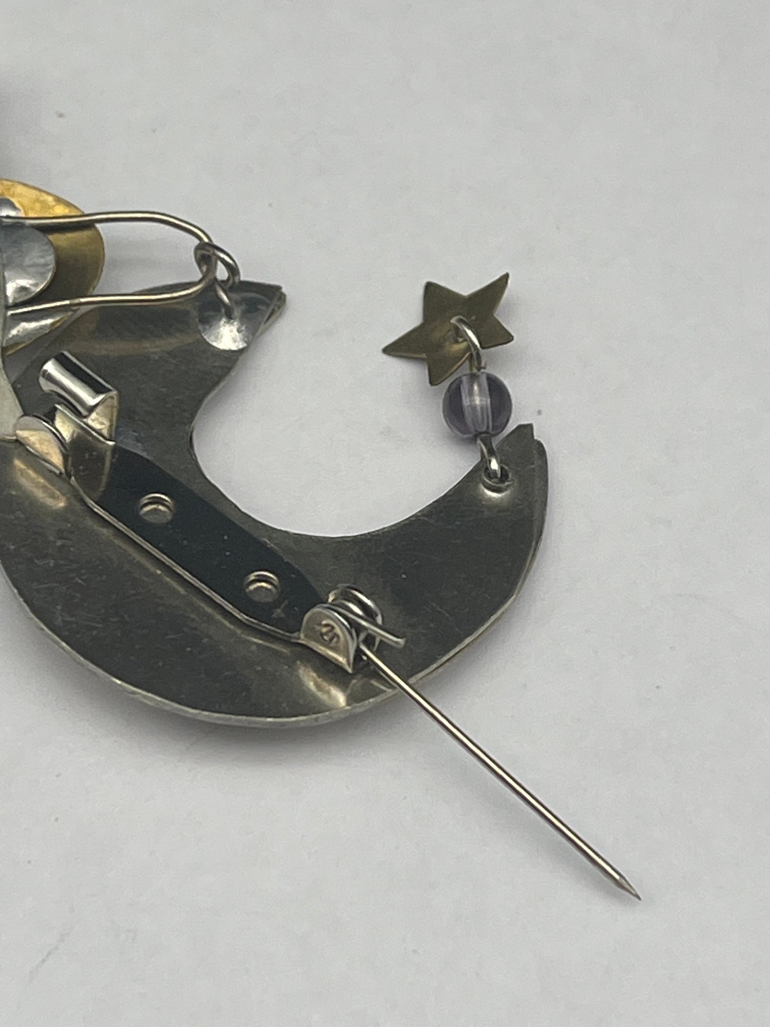 Whimsical Tri-Metal Angel And Moon Brooch, Art Deco, About 3" Long