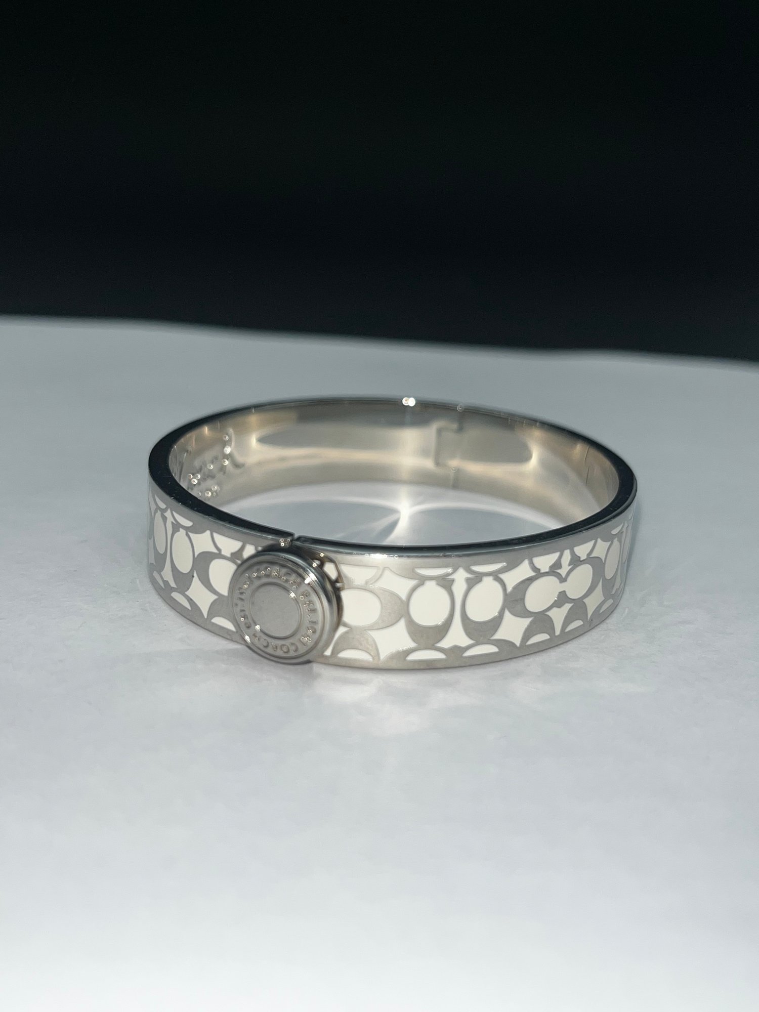 White And Silver Hinged Bracelet, Squeeze Button Clasp, Coach Logo And Markings, No Authentication Available