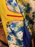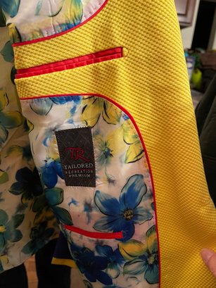 Bright yellow textured men’s blazer / sport coat by TR Tailored Recreation Premium. This eye-catching jacket features a honeycomb-style textured fabric with patch pockets and a striking blue floral interior lining accented with red piping. A bold statement piece that would stand out for spring or summer events, parties, or casual styling.