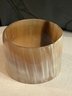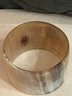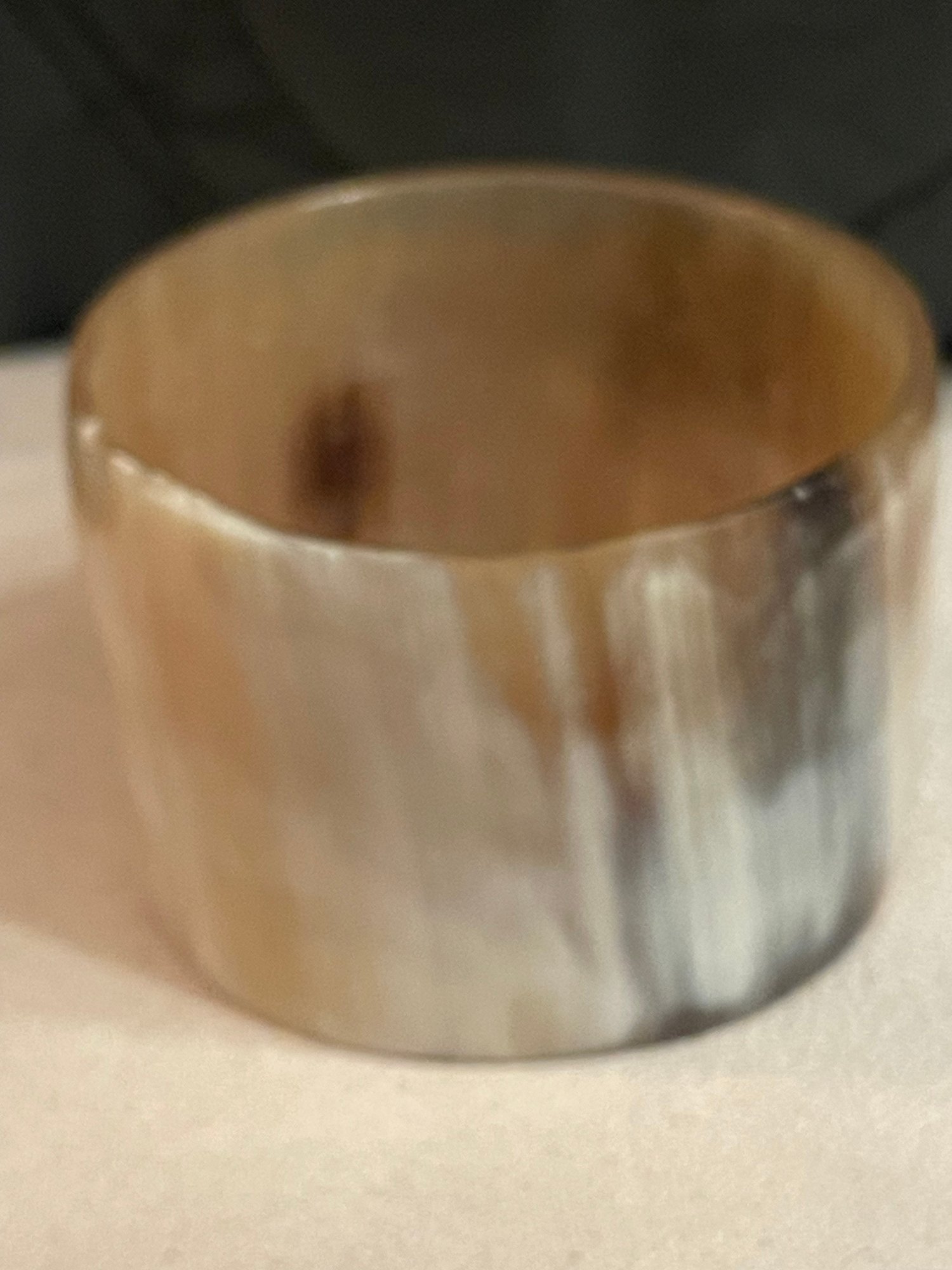 Striking extra wide bangle bracelet crafted from natural buffalo horn featuring beautiful translucent tones of caramel brown, cream, gray, and dark natural striations. Each horn bracelet has unique organic patterning created by the natural material.
