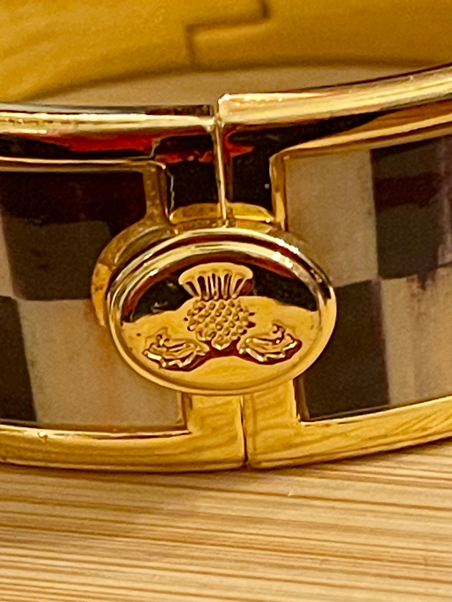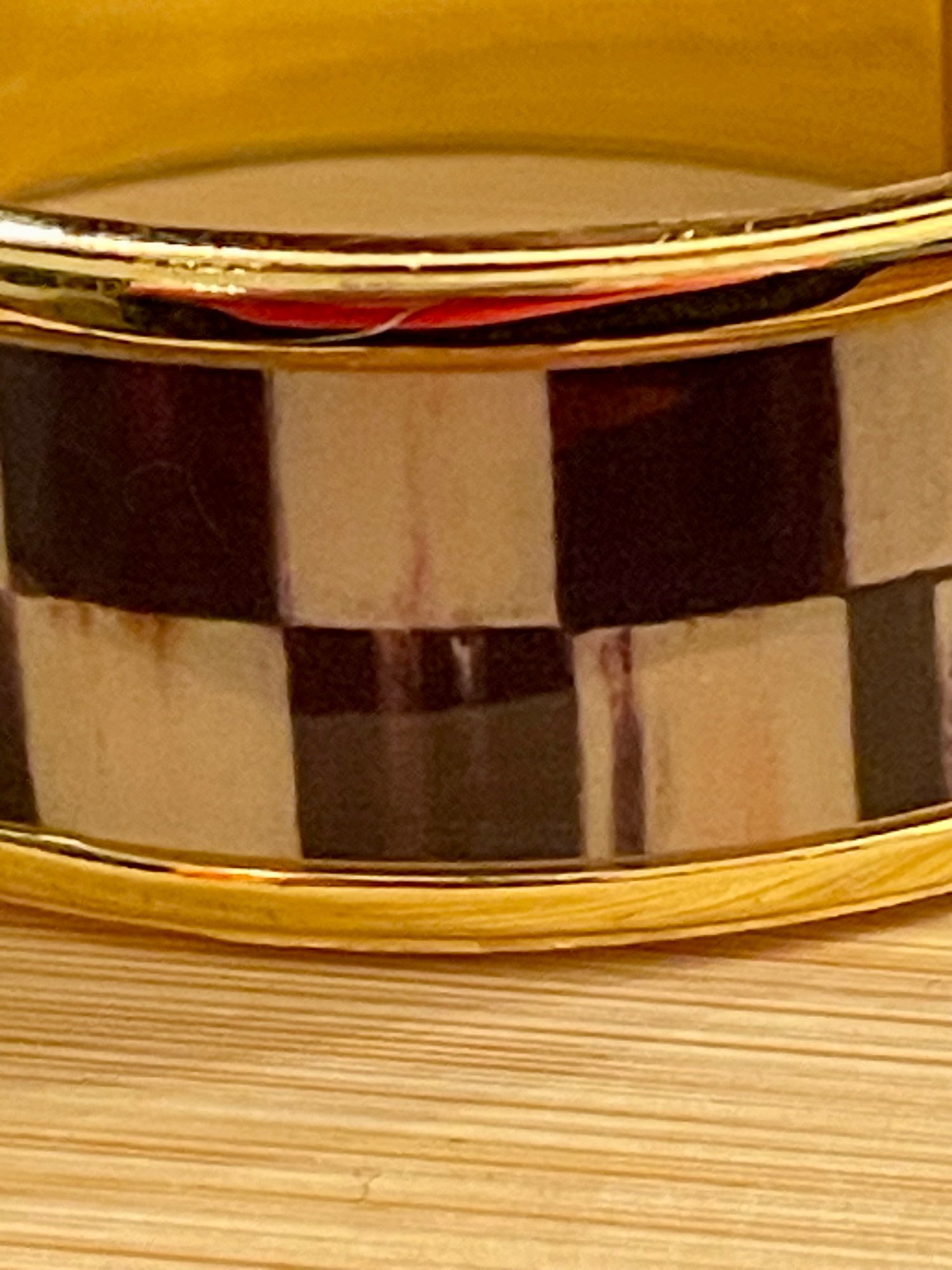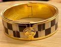 Designer Mackenzie-Childs Courtly Check hinged bangle bracelet featuring the brand’s iconic black and ivory checkerboard enamel pattern set in a polished gold-tone frame. The bracelet closes with a hinged clasp accented by a small decorative medallion.