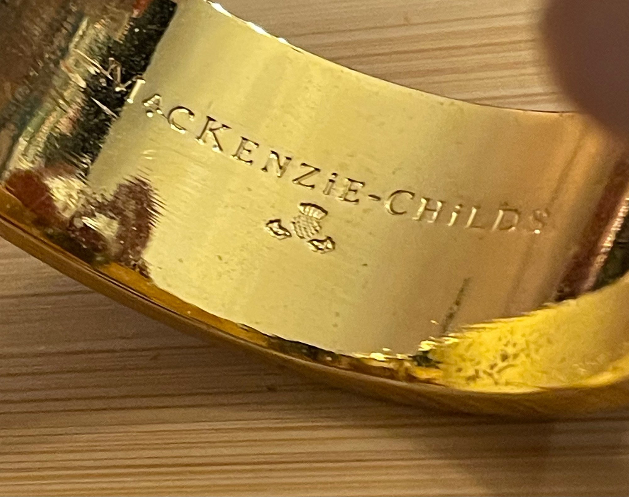 The recognizable Courtly Check motif is one of Mackenzie-Childs’ signature designs and pairs well with both casual and dress looks. A stylish collectible accessory for fans of the brand.