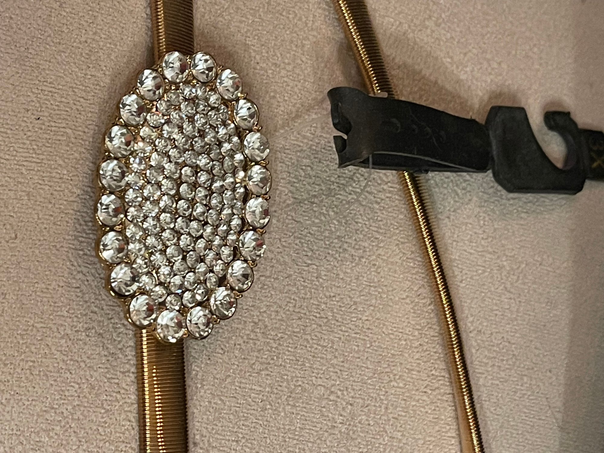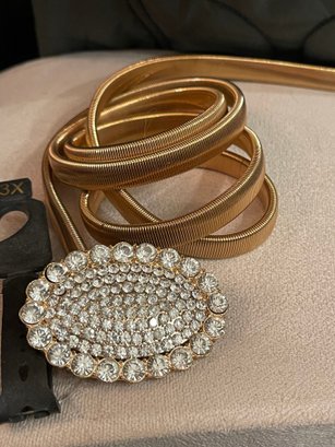 New old stock gold tone stretch coil belt featuring a large oval rhinestone pavé buckle. Marked size 3X and measures approximately 38 inches unstretched, with flexible stretch to accommodate a larger waist.