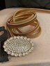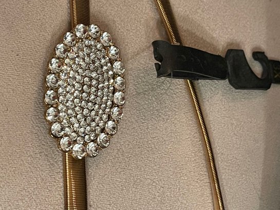 This statement belt features a coiled metal stretch design with a sparkling rhinestone centerpiece, perfect for dresses, tunics, or evening wear. A versatile accessory that adds vintage-inspired glamour.