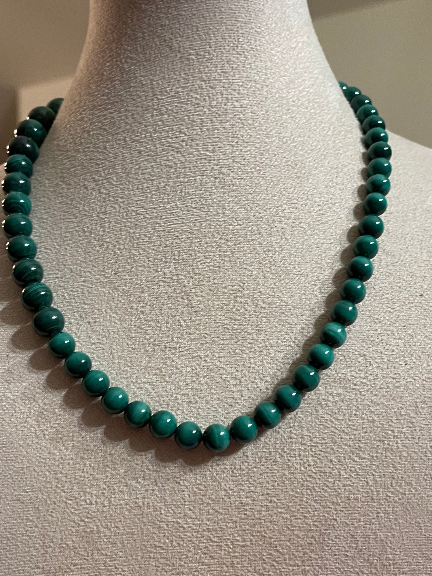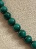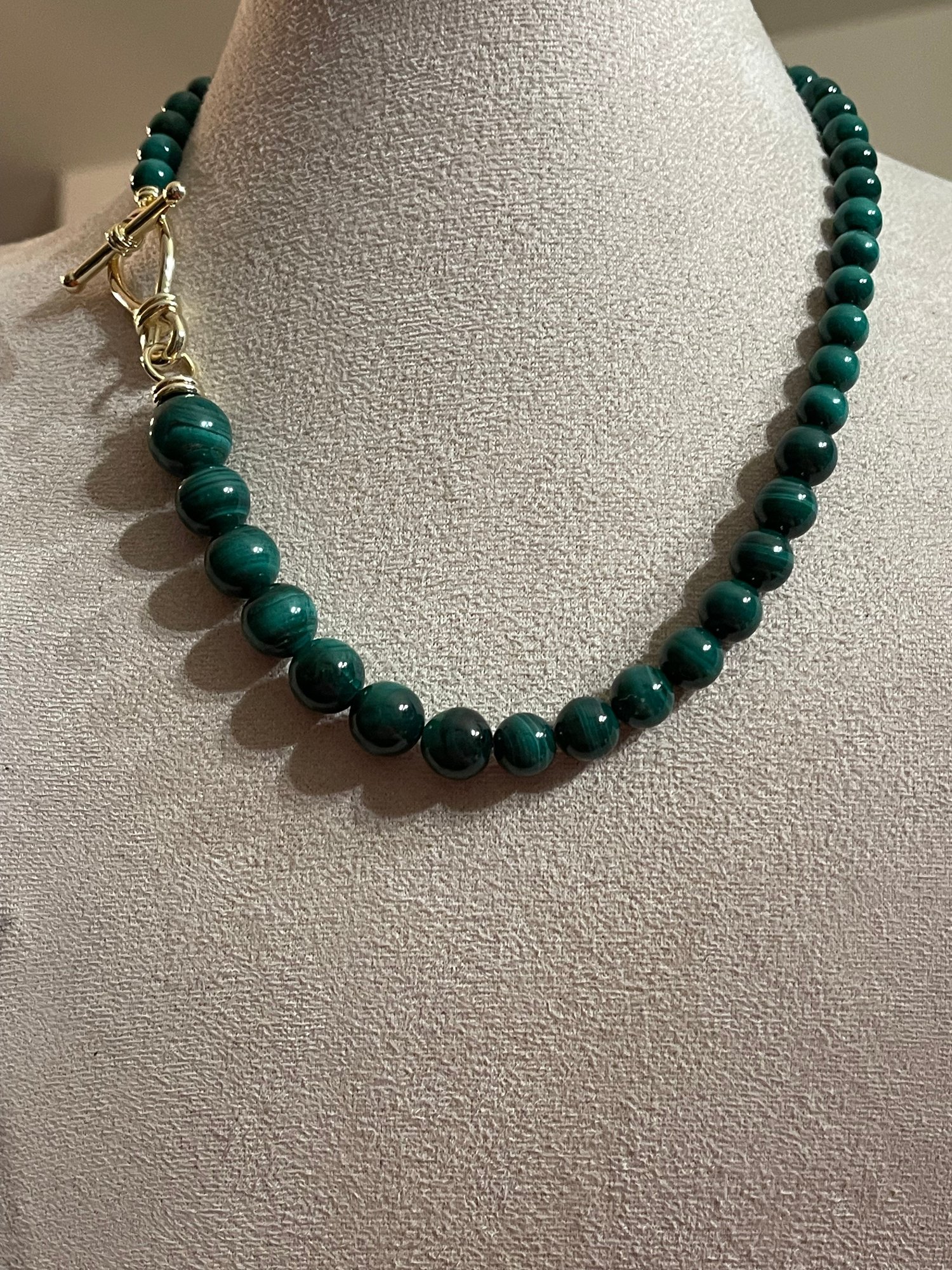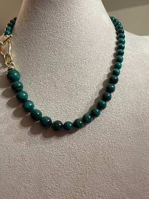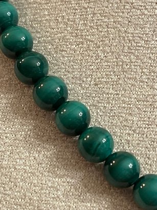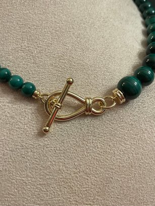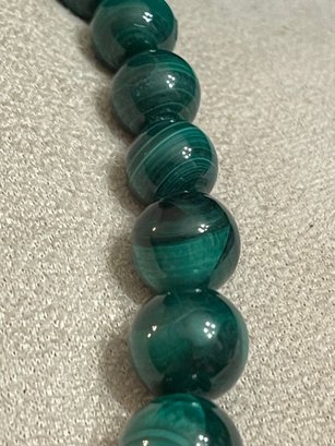 Graduated malachite bead necklace featuring polished round beads with natural green banding. Beads increase in size toward the center and are finished with a decorative gold-tone toggle clasp. Malachite is known for its rich green color and striking banded patterns. In good condition with light wear consistent with age.
