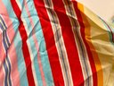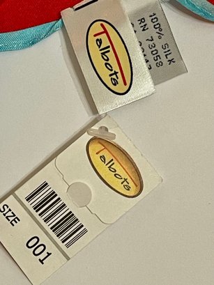 New with tags Talbots 100% silk scarf featuring vibrant multicolor stripes in red, aqua blue, pink, yellow, and cream. Lightweight with a smooth silk sheen and finished with aqua edging. Excellent new condition with original tags attached.