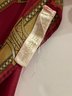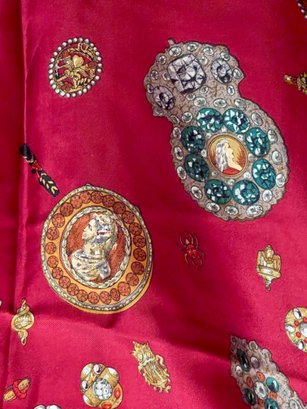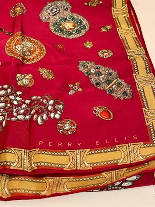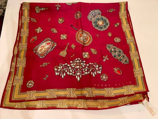 Vintage Perry Ellis designer silk oblong scarf featuring an ornate baroque-style jewelry motif with cameos, brooches, watches, and gemstone designs on a rich red background with decorative gold border. Elegant long rectangular scarf that can be worn as a neck scarf, head wrap, or handbag accessory.