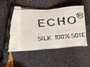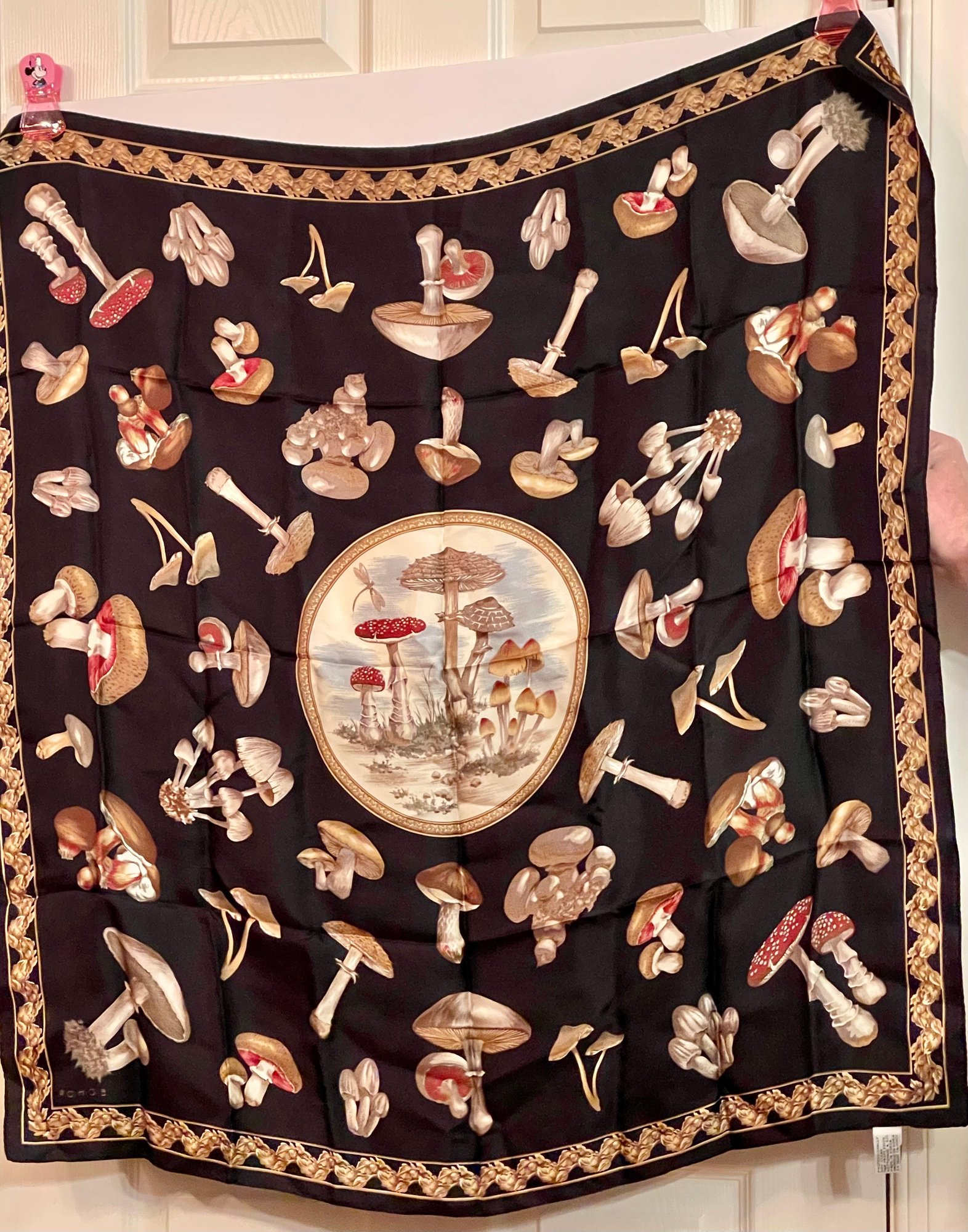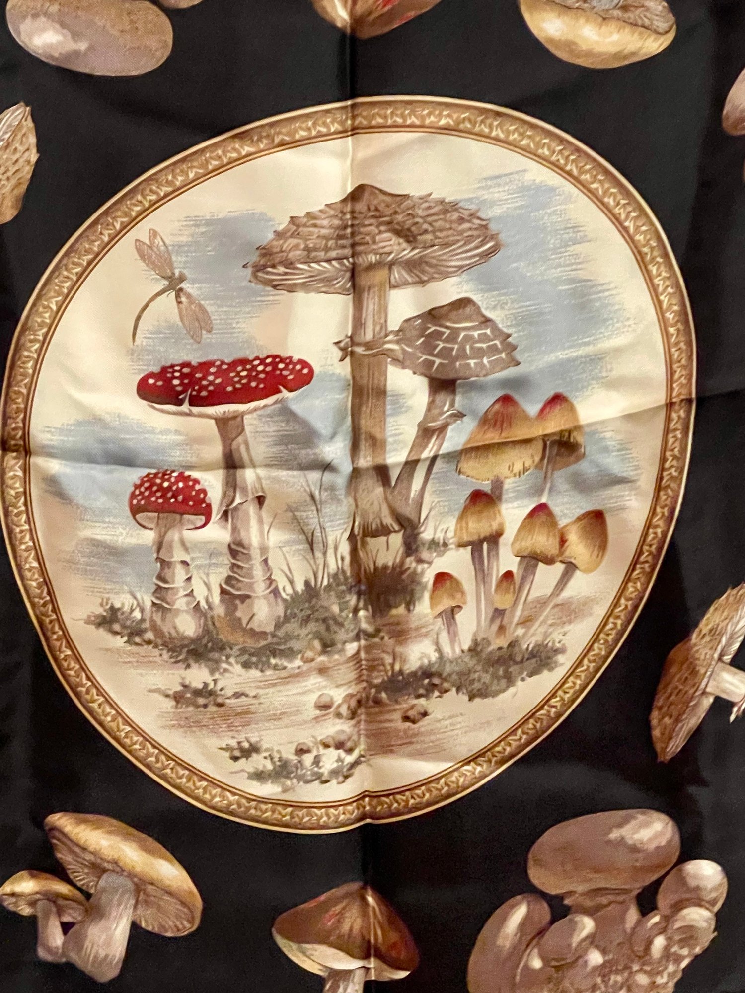 Vintage ECHO 100% silk square scarf featuring a detailed botanical mushroom and woodland fungi design on a black background with decorative border. The center medallion shows a naturalistic mushroom study surrounded by various illustrated toadstools.